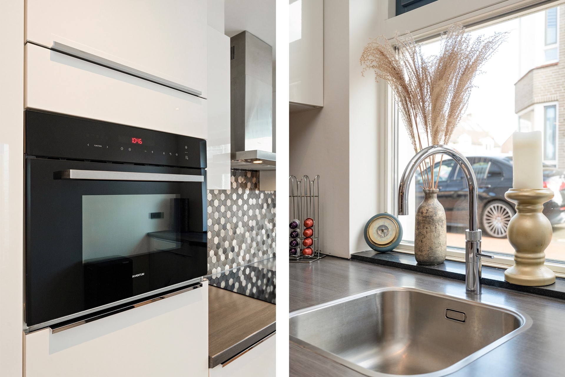 Aan de achterzijde bevindt zich de moderne, luxe keuken, praktisch ingericht en voorzien van diverse inbouwapparatuur, waaronder een vaatwasser en een Quooker. Via een deur is de achtergelegen plaats bereikbaar, met toegang tot de berging, stookruimte (Cv-installatie HR 2019 t.b.v. het zomerhuis) en het achterom.