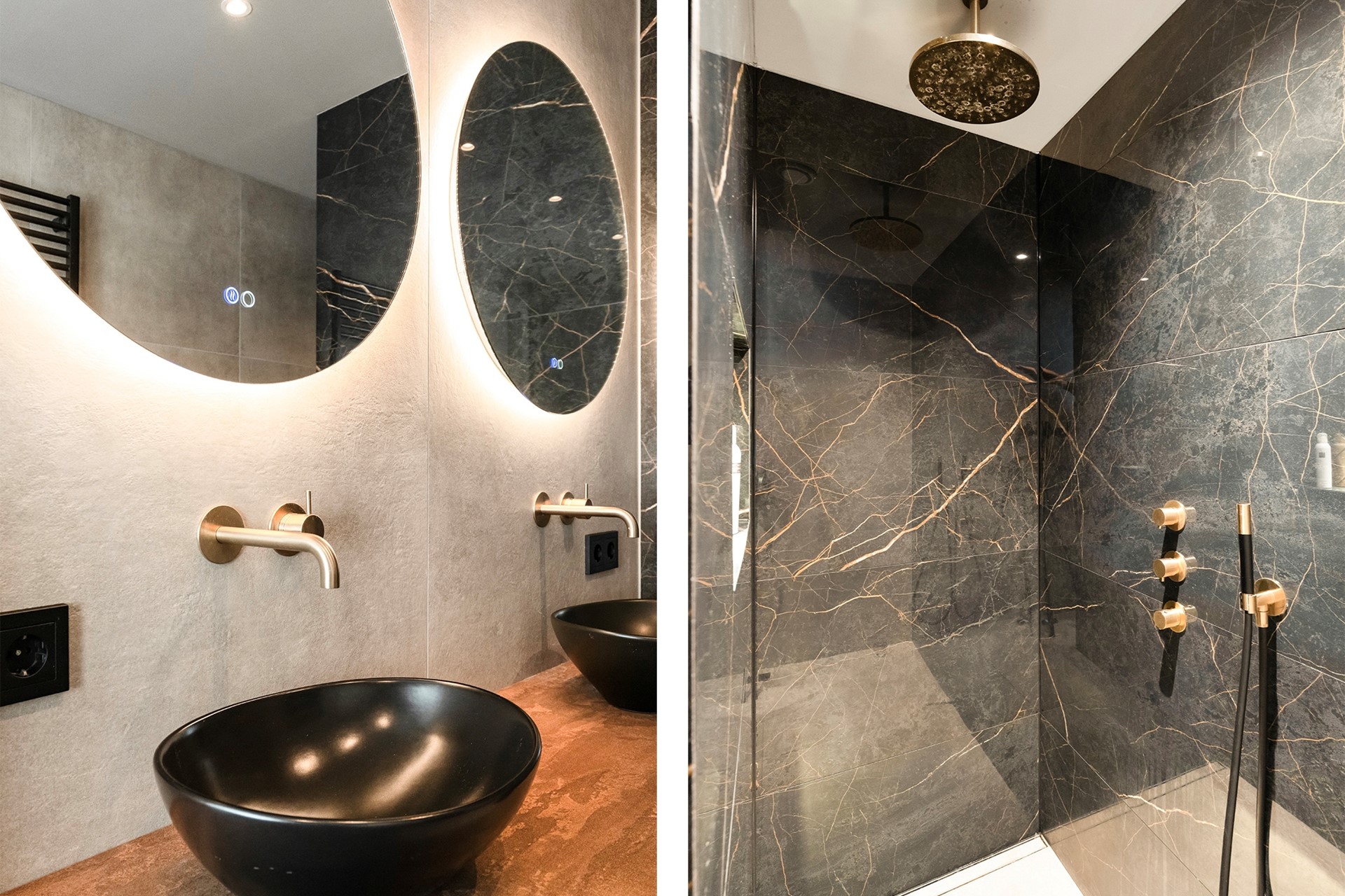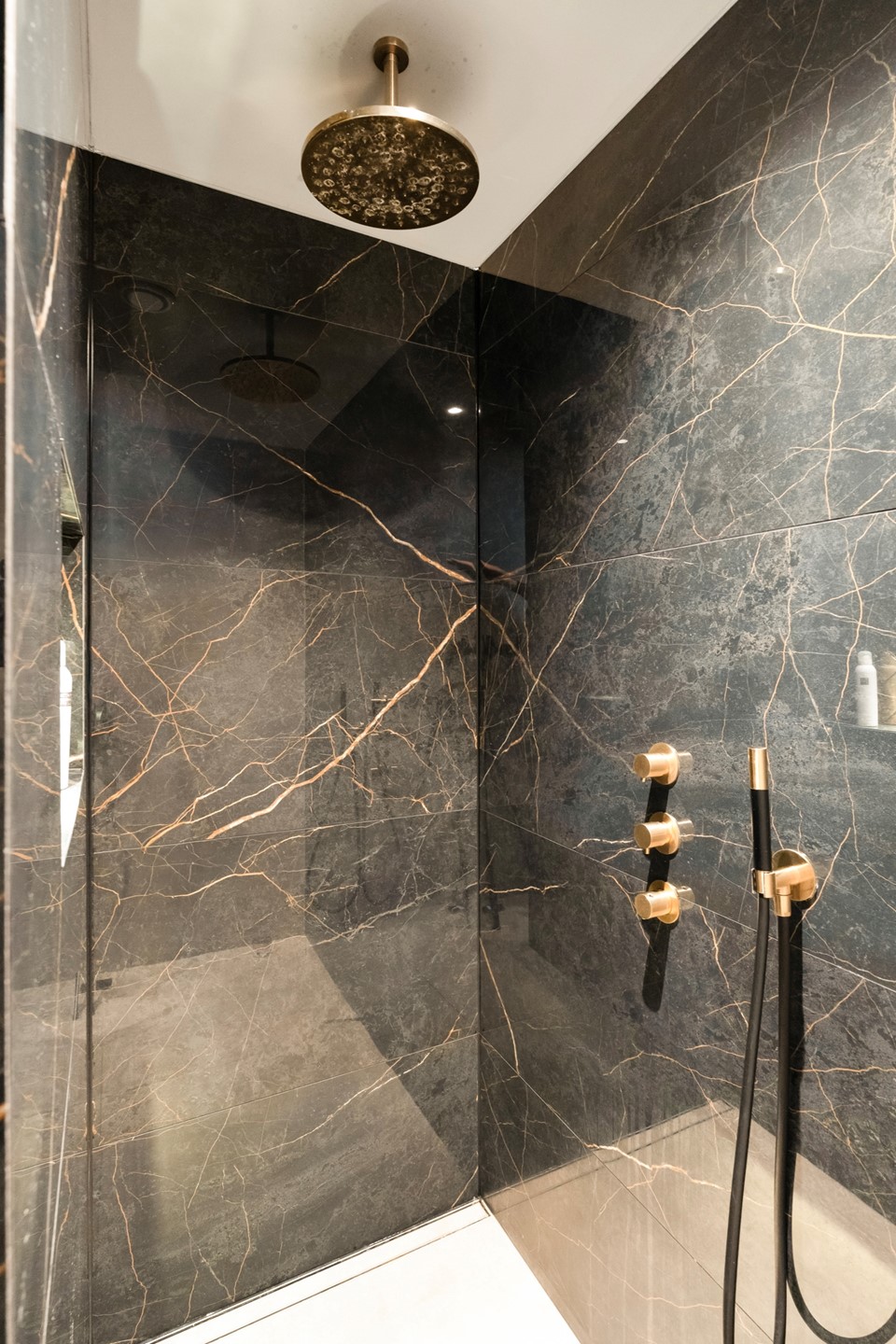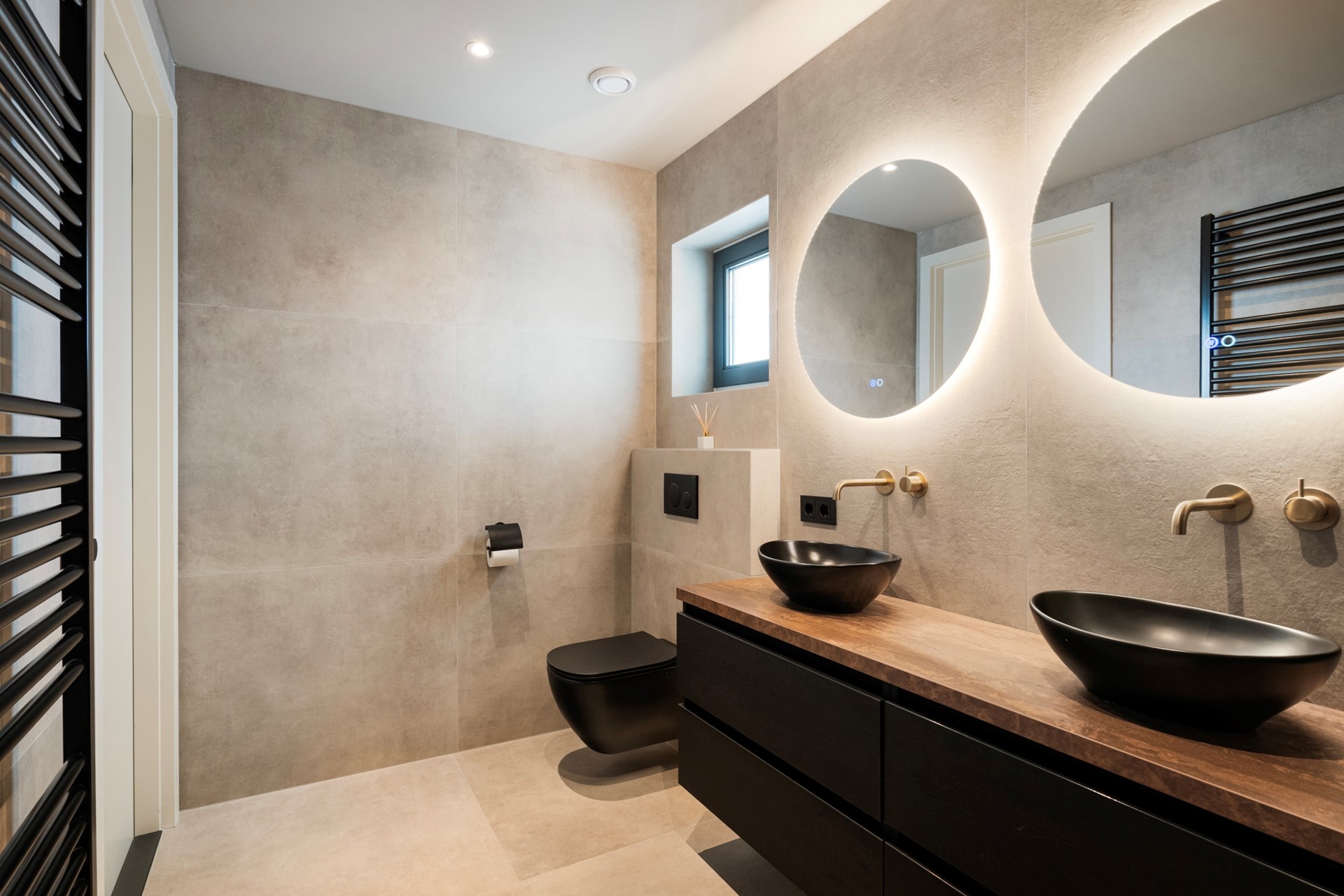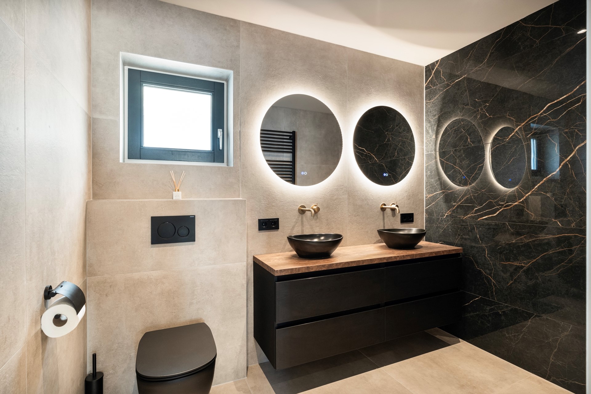 De badkamer is luxe en modern uitgevoerd en sluit naadloos aan bij de kwaliteit van de rest van de woning – een comfortabele plek om iedere dag van te genieten.