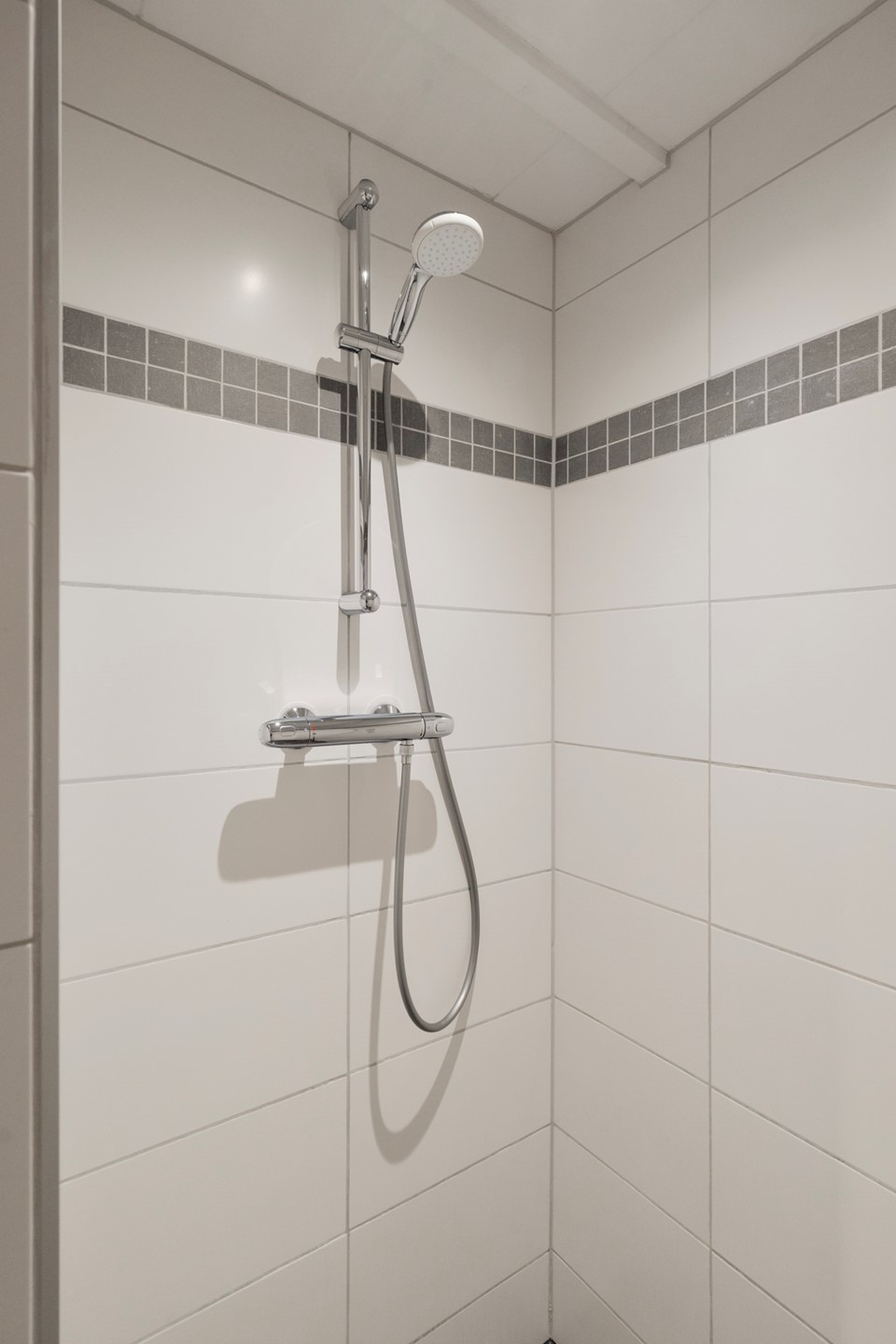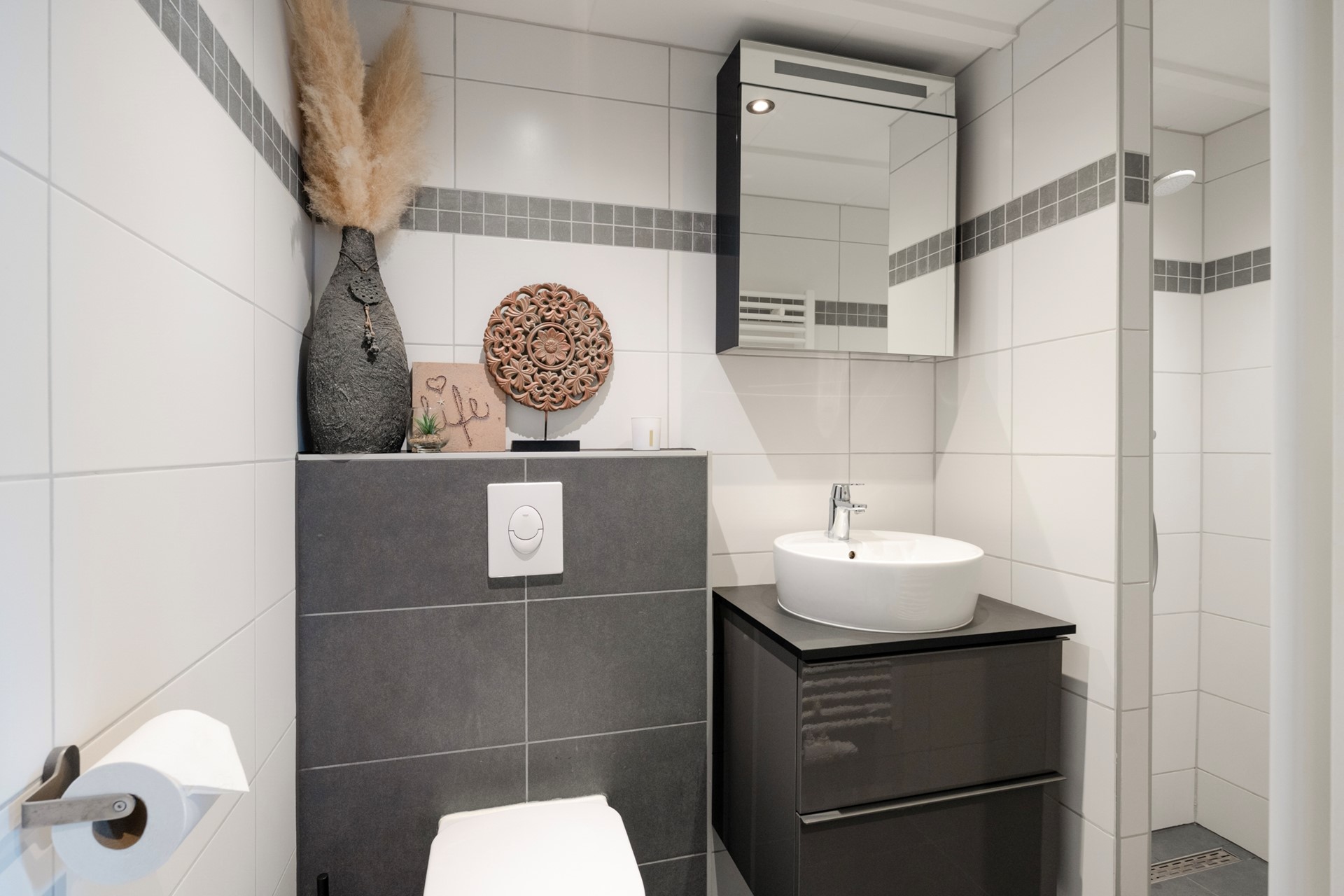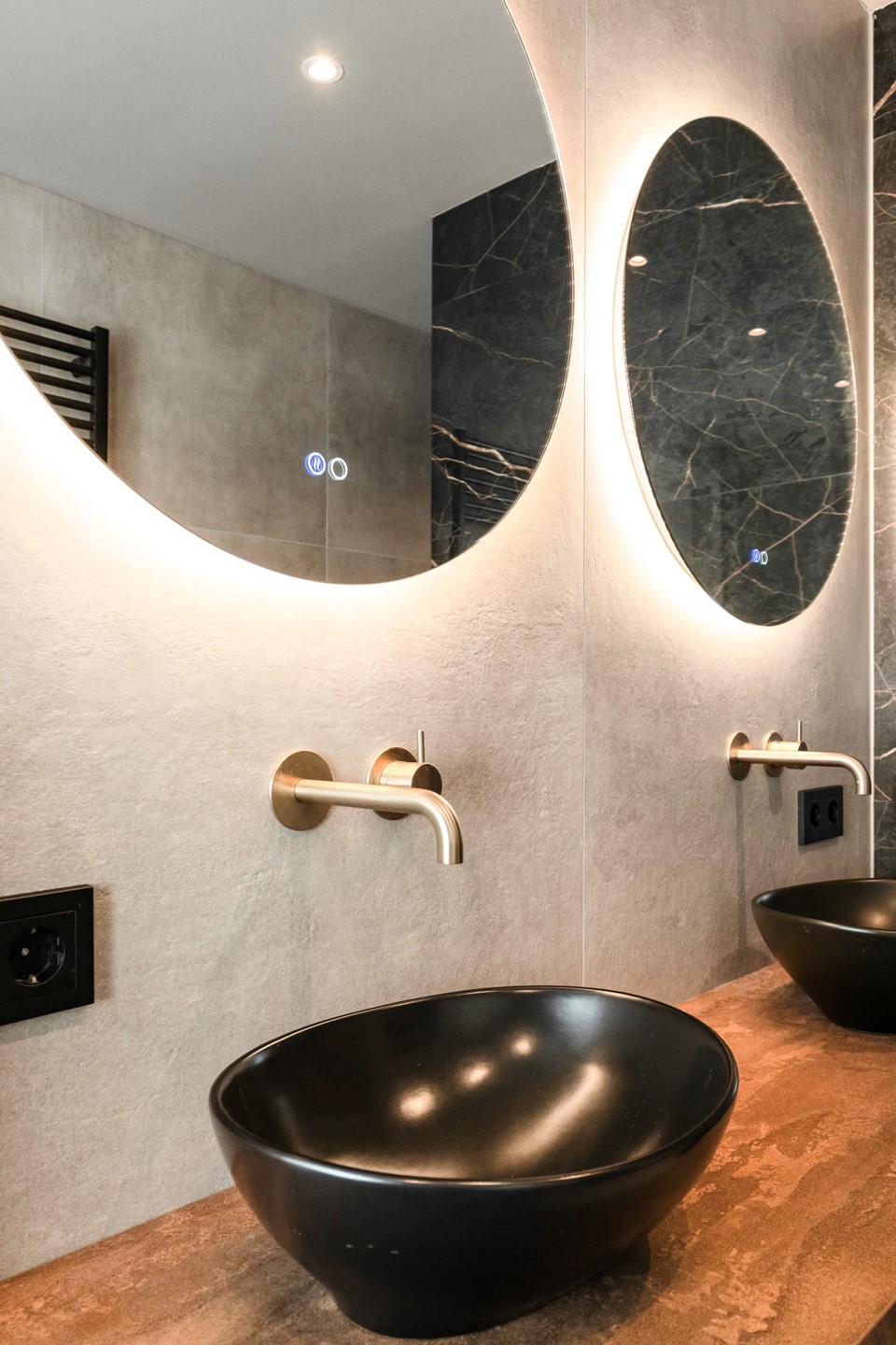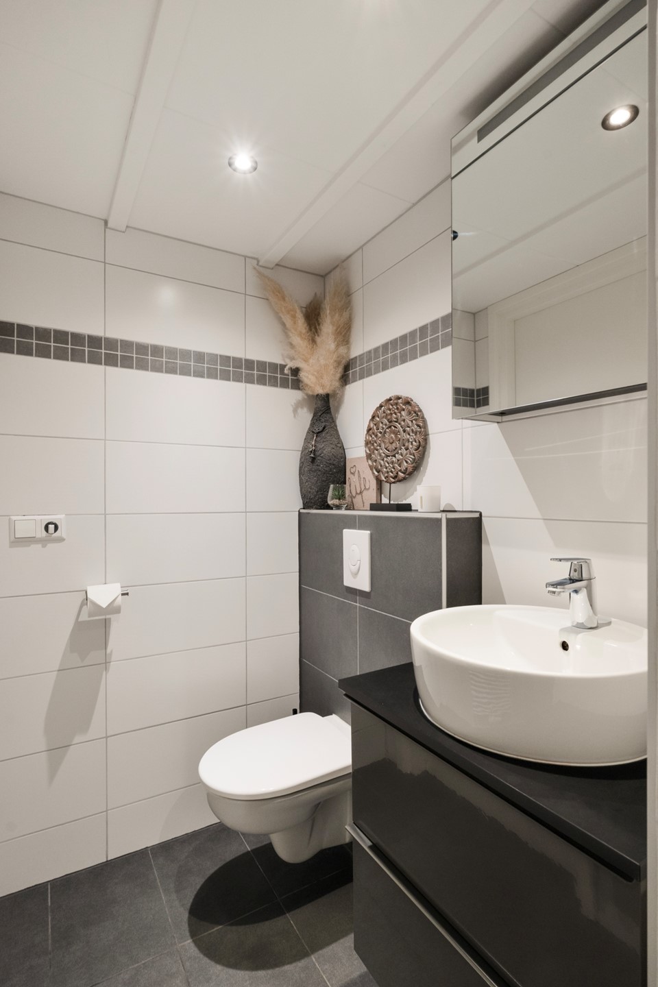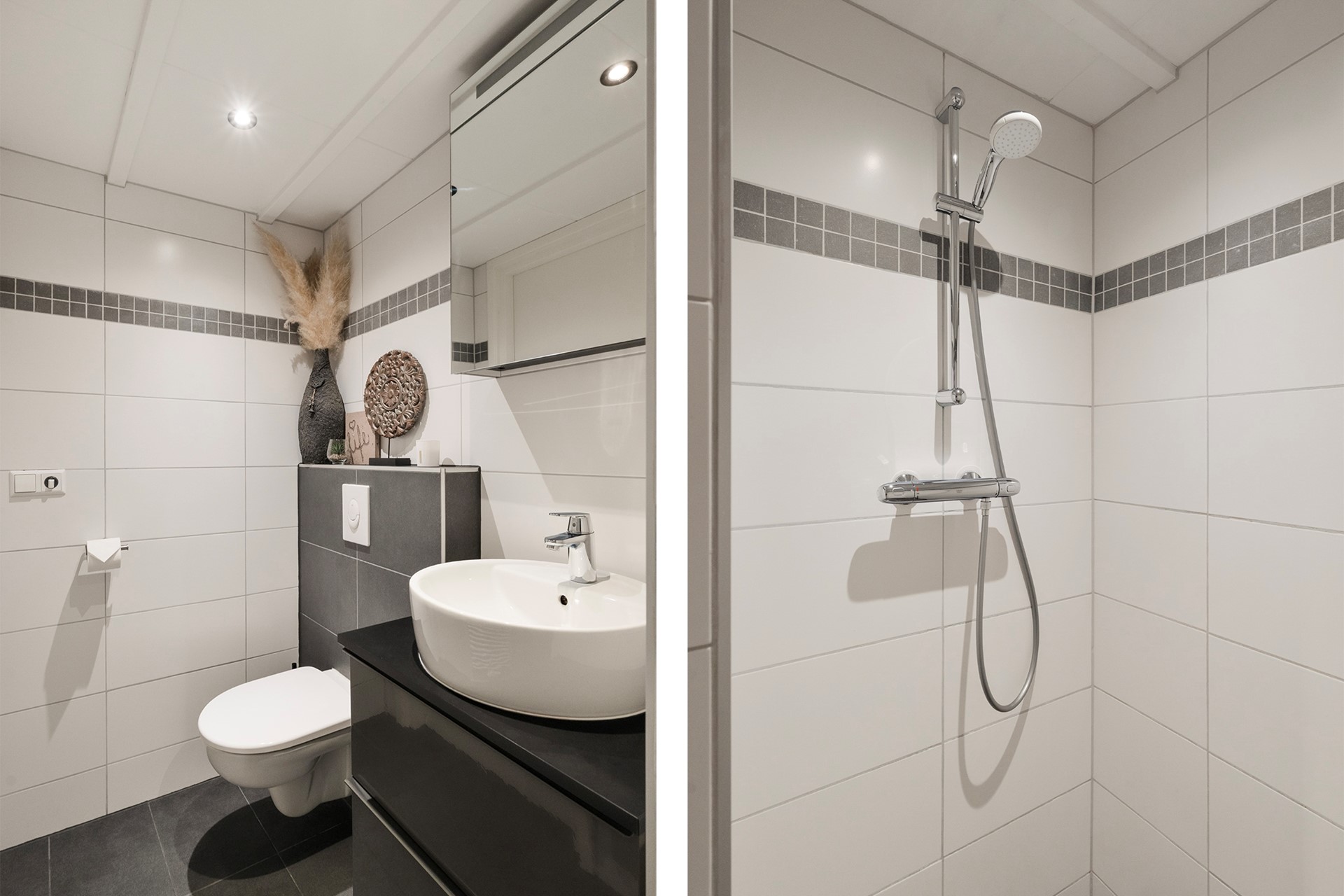 De badkamer is luxe en modern uitgevoerd en sluit naadloos aan bij de kwaliteit van de rest van de woning – een comfortabele plek om iedere dag van te genieten.
