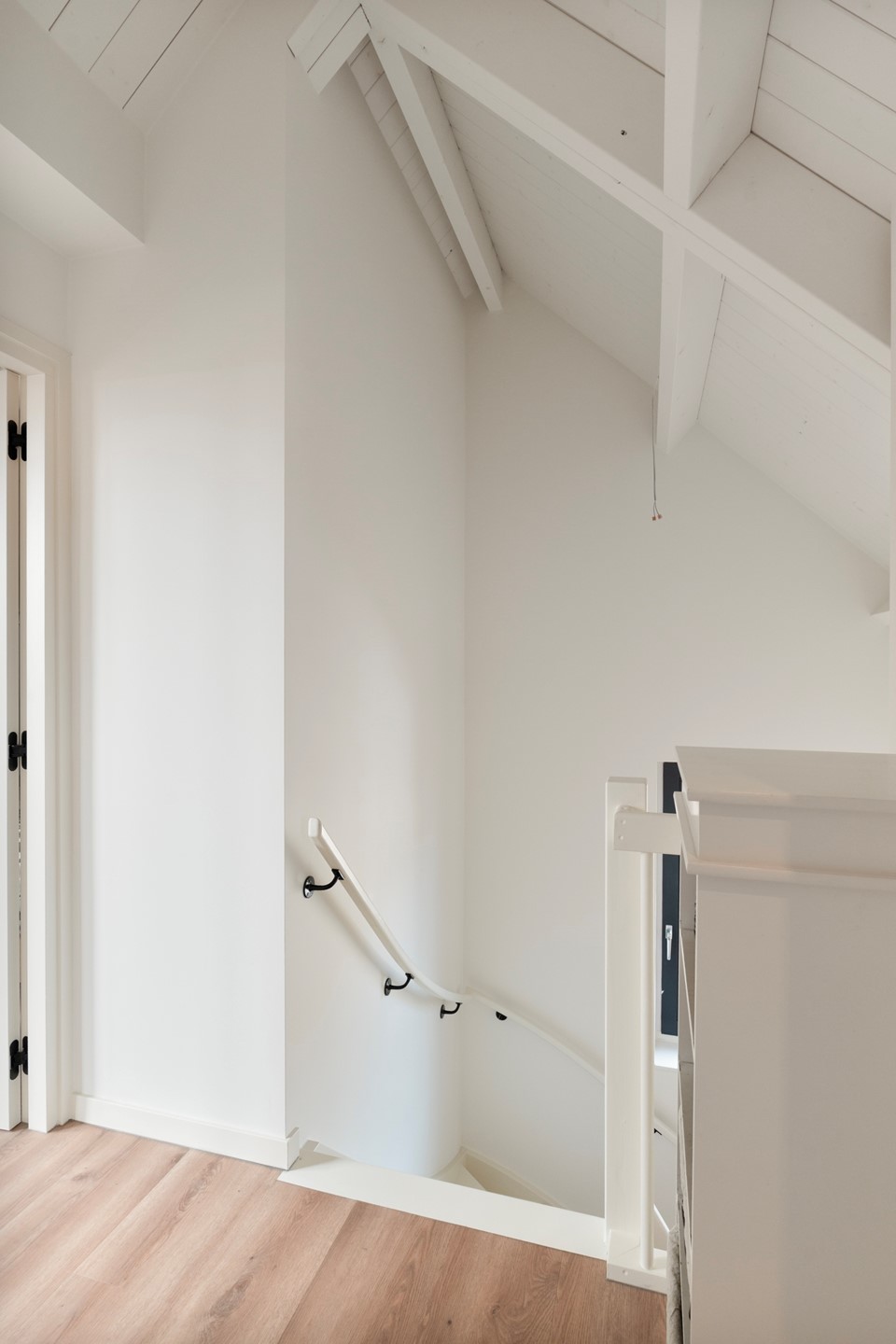 Overloop met vaste trap naar de tweede verdieping en toegang tot drie slaapkamers en de badkamer. De overloop valt op door de prettige lichtinval en de open trapruimte, ideaal voor het plaatsen van een fraaie hanglamp.