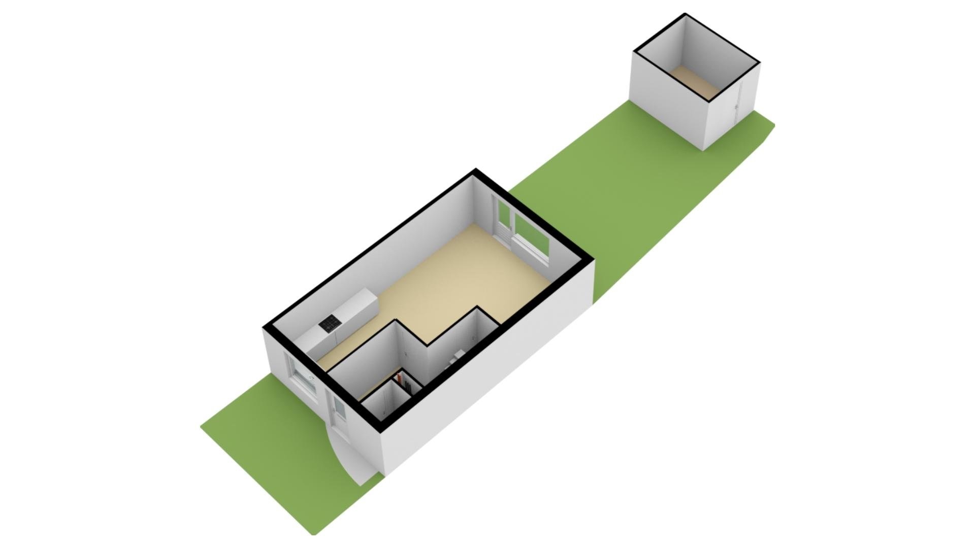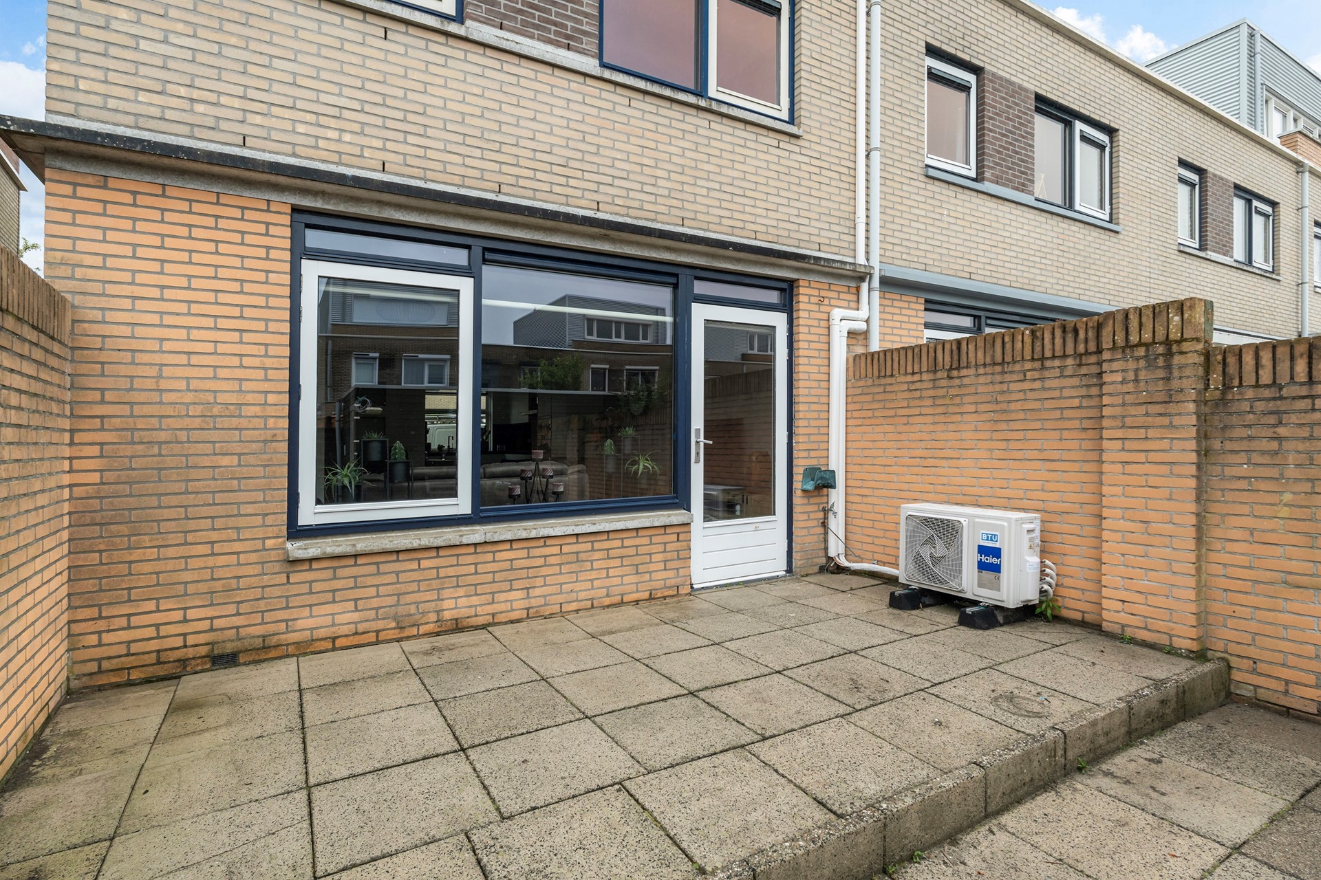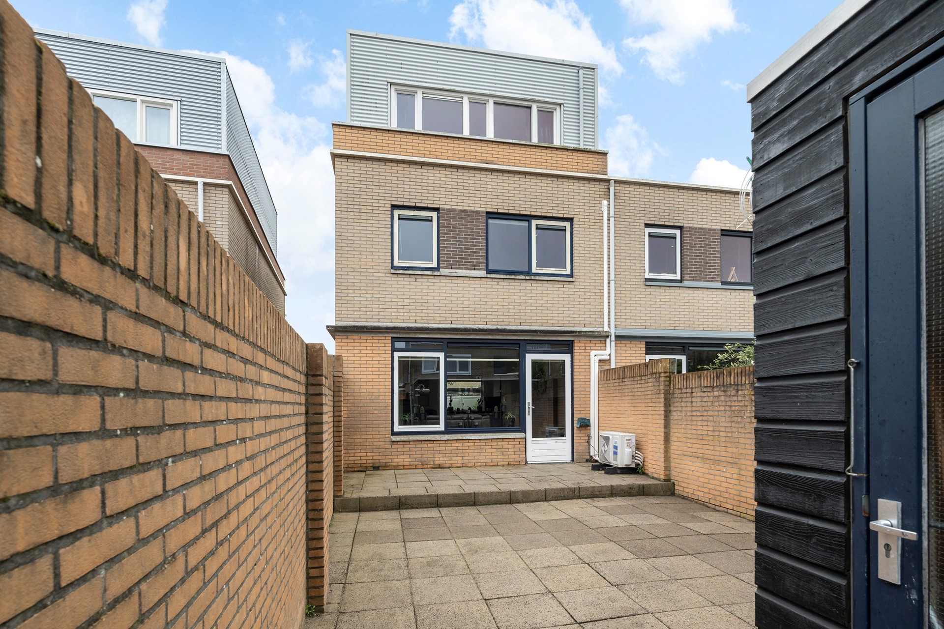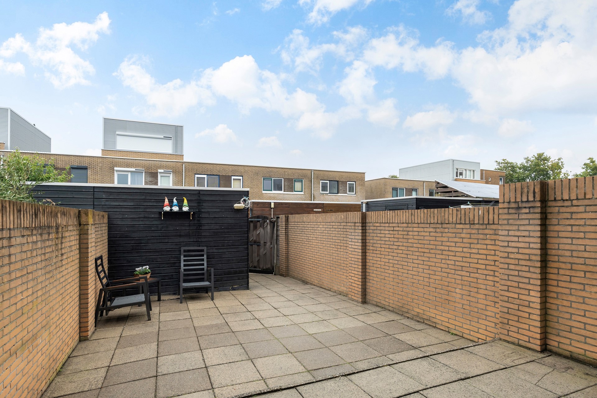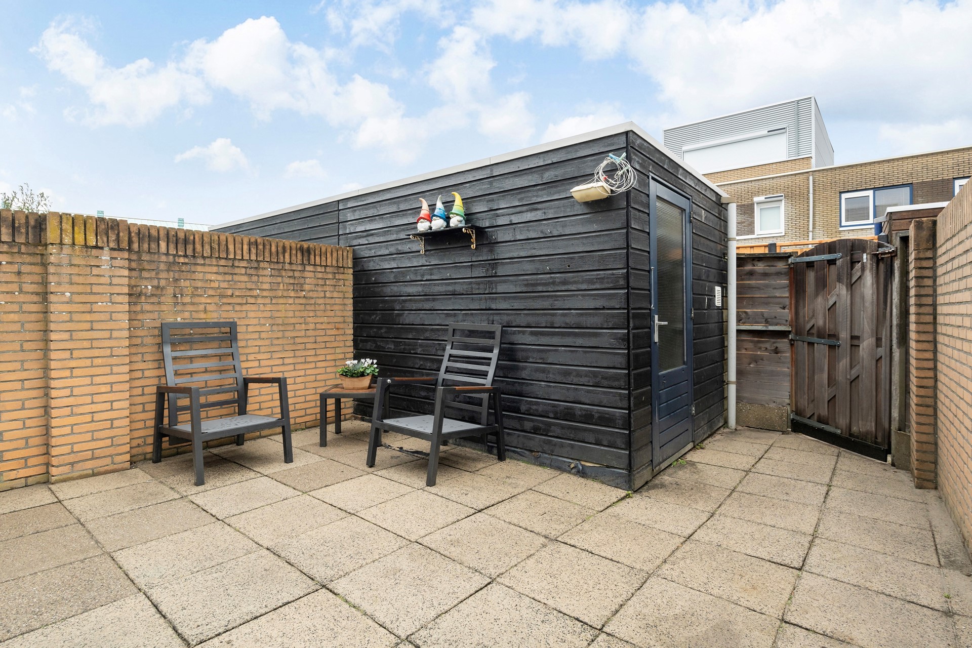 Zowel de voor- als de achtertuin is netjes betegeld en daardoor onderhoudsarm. In de achtertuin bevindt zich een vrijstaande houten berging met elektra en er is een achterom. Door de hoekligging van de woning en de diepte van de tuin is er ondanks de noordoostelijke ligging verrassend veel zon in de tuin aanwezig.