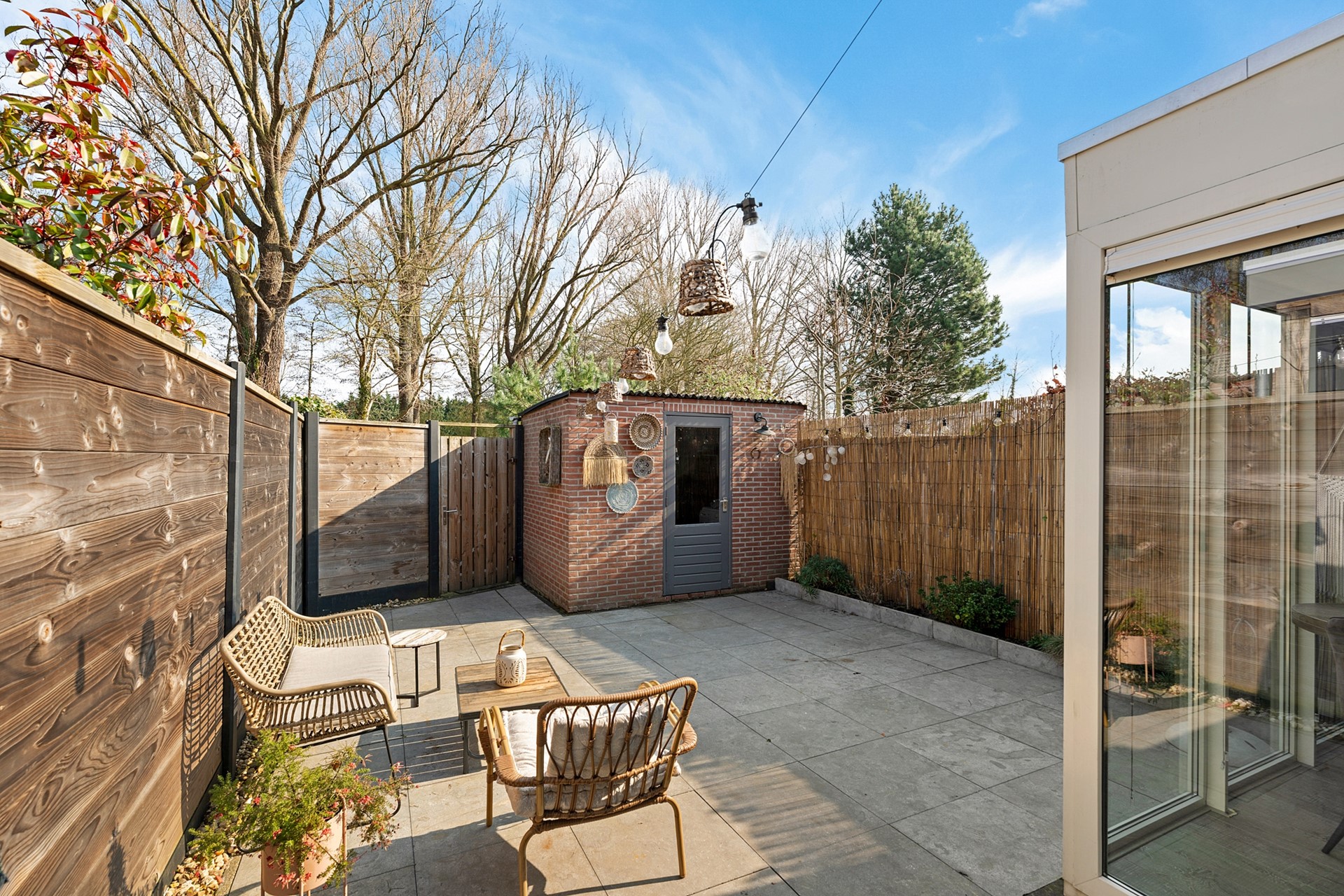 De achtertuin is verzorgd aangelegd en biedt veel privacy. Achterin de tuin bevindt zich een vrijstaande stenen berging met elektra, ideaal voor fietsen en opslag.