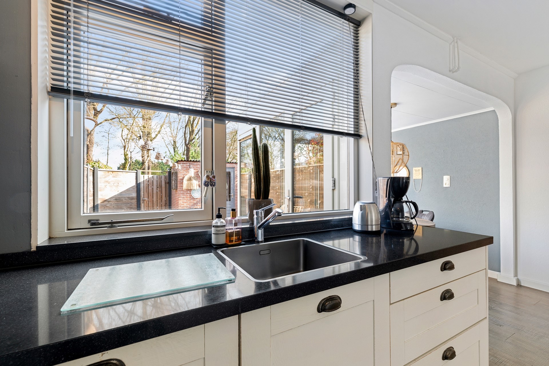 De woonkamer is gelegen aan de voorzijde van de woning, is voorzien van een fraaie laminaatvloer en heeft een prettige lichtinval. Vanuit de woonkamer is er uitzicht op de rustige Klappermansstraat. Door de uitbouw aan de achterzijde is er ruim voldoende plek voor een gezellige eethoek. De keuken is open, heeft het zicht op de achtertuin en is voorzien van diverse inbouwapparatuur. Opvallend prettig is de ruimte die we op de begane grond aantreffen in combinatie met lekker veel licht.