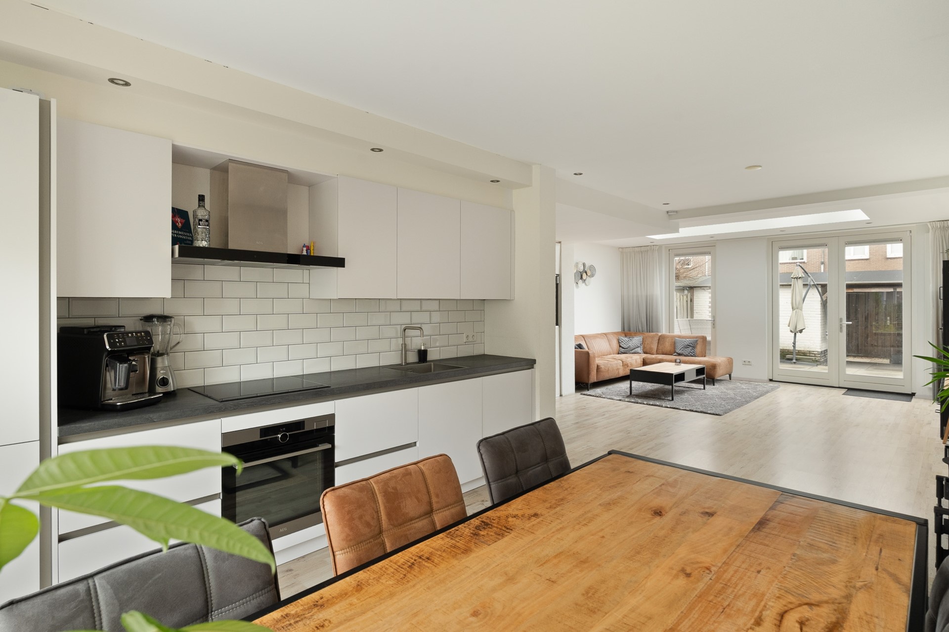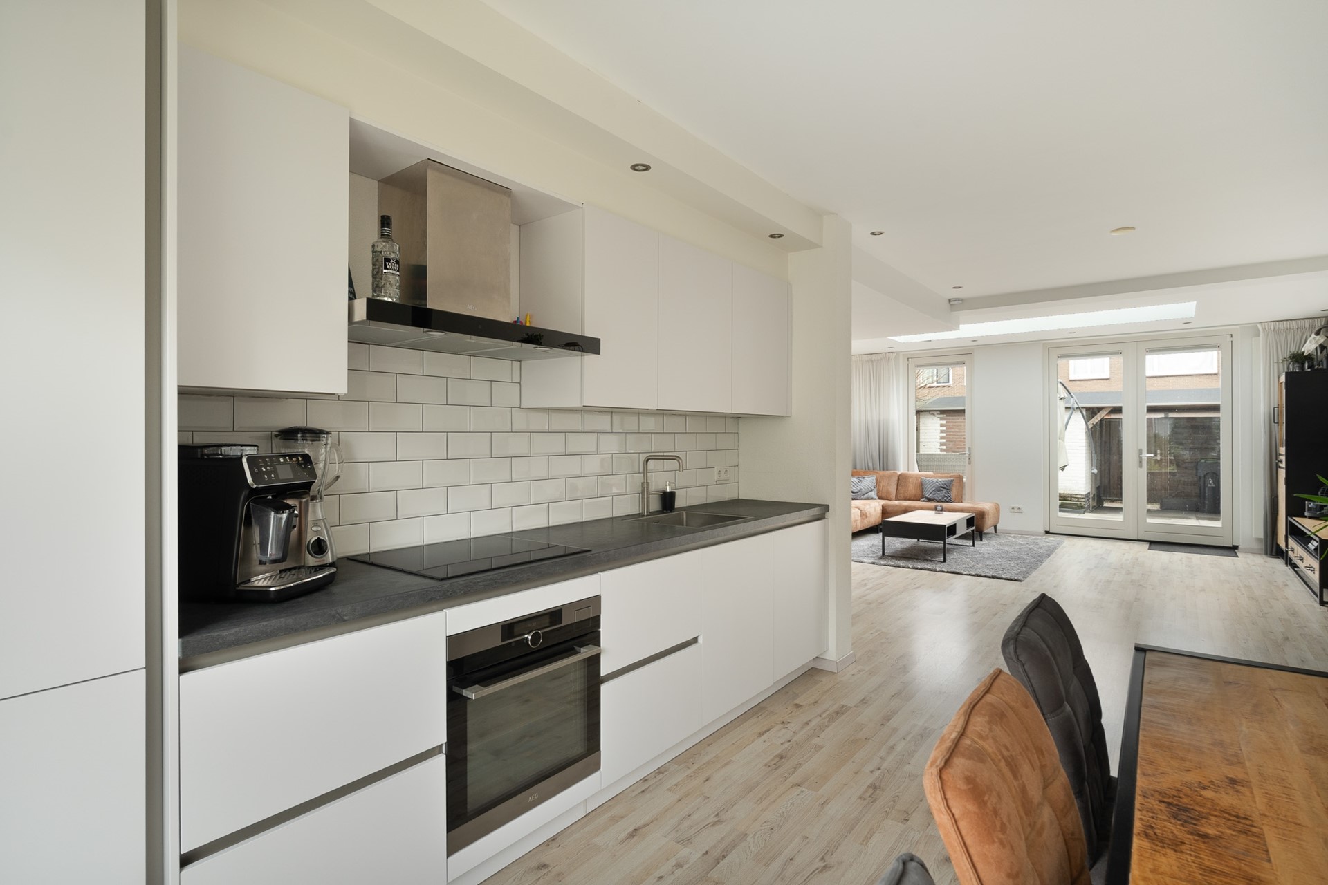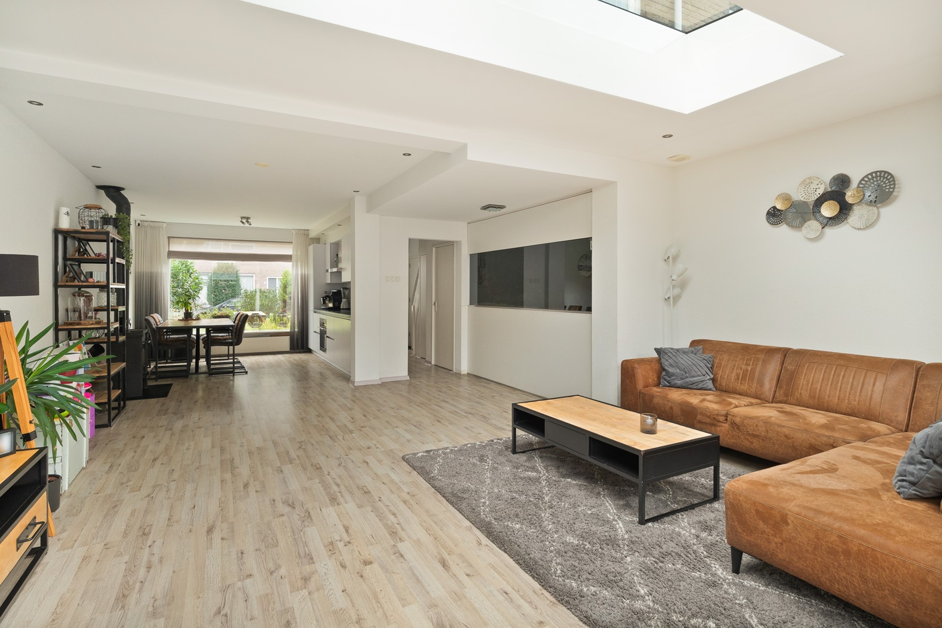 De begane grond is afgewerkt met een lichte laminaatvloer die doorloopt over het gehele oppervlak. De woonkamer is 3,5m uitgebouwd en hierdoor riant. In de aanbouw zorgt een lichtstraat voor extra daglicht en een ruimtelijk gevoel. Alle plafonds zijn strak gestuct en de wanden zijn afgewerkt met spachtelputz.