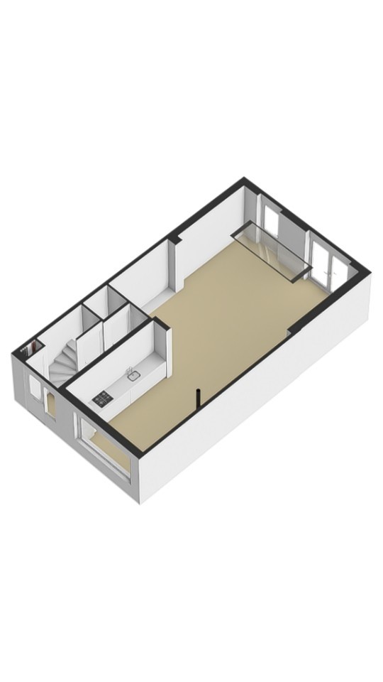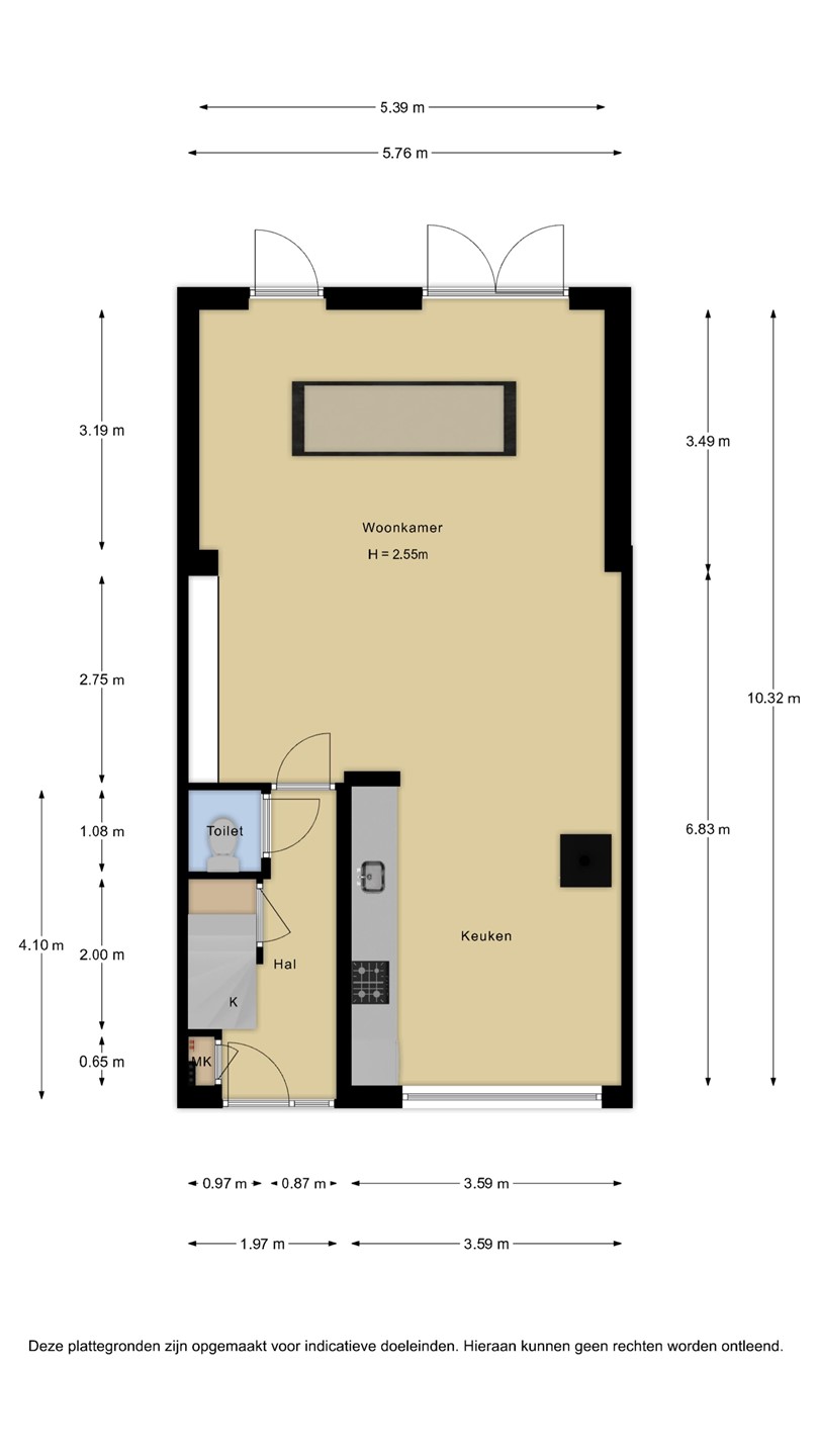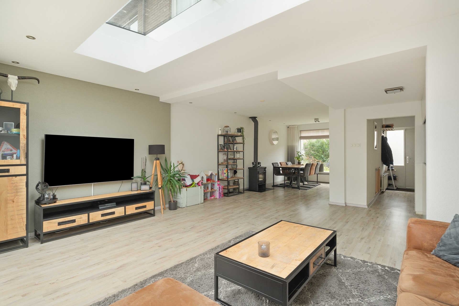 De begane grond is afgewerkt met een lichte laminaatvloer die doorloopt over het gehele oppervlak. De woonkamer is 3,5m uitgebouwd en hierdoor riant. In de aanbouw zorgt een lichtstraat voor extra daglicht en een ruimtelijk gevoel. Alle plafonds zijn strak gestuct en de wanden zijn afgewerkt met spachtelputz.