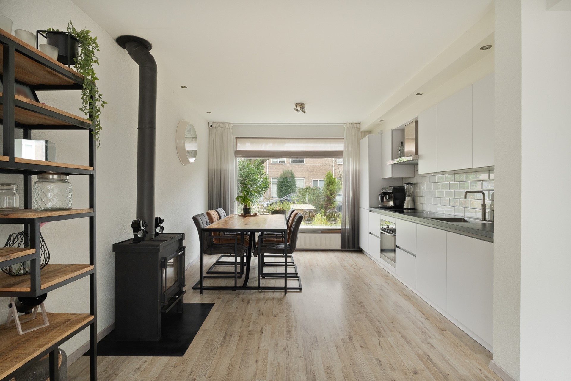 De open keuken is uitgevoerd in een wit-grijze kleurstelling met een donkergrijs leisteen werkblad en voorzien van diverse inbouwapparatuur, waaronder een inductiekookplaat, afzuigkap, stoomoven, magnetron, vaatwasser, Quooker en koel-vriescombinatie. Een ingebouwd aquarium en een houtkachel zorgen voor extra sfeer.