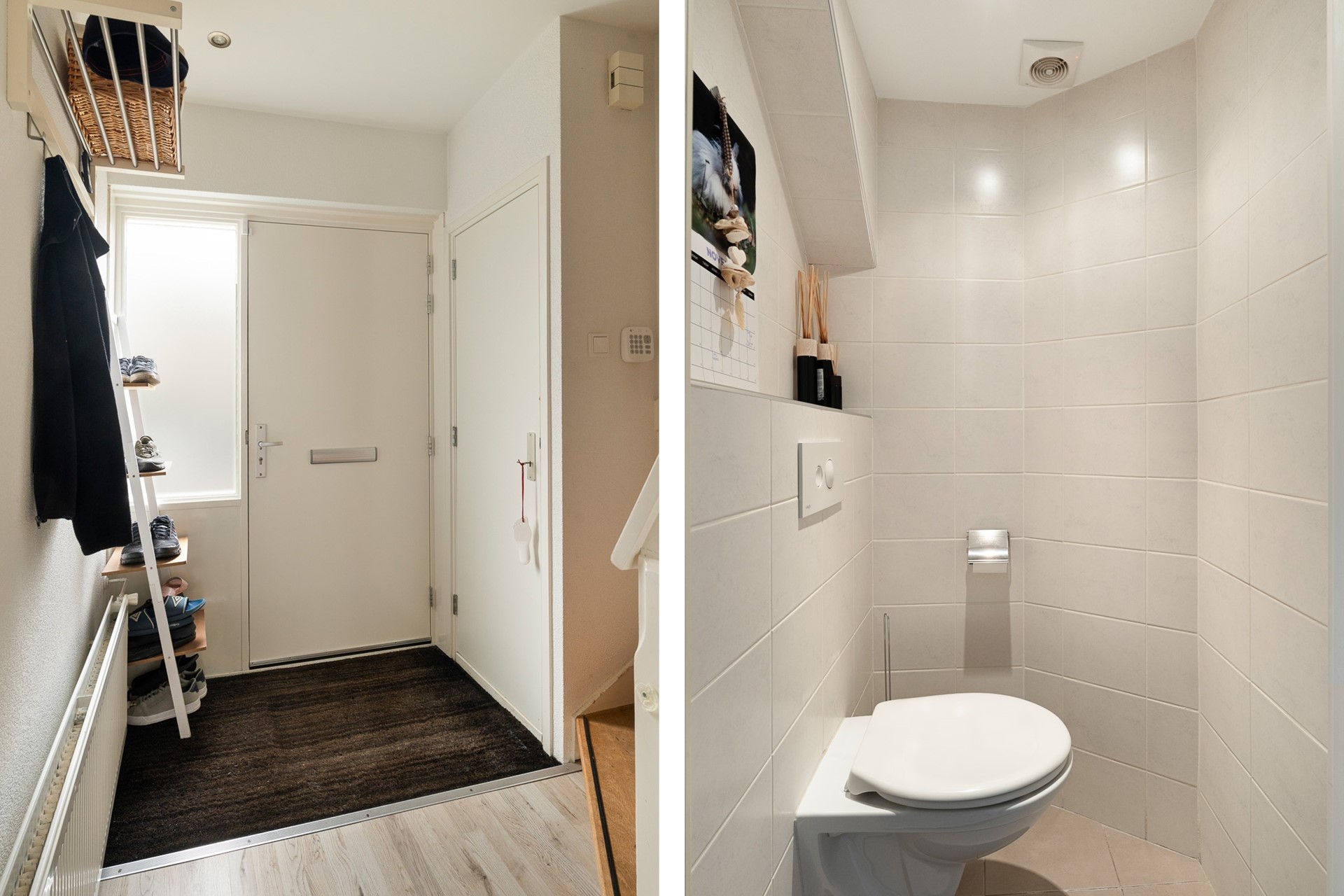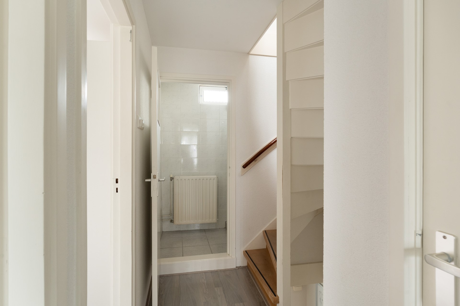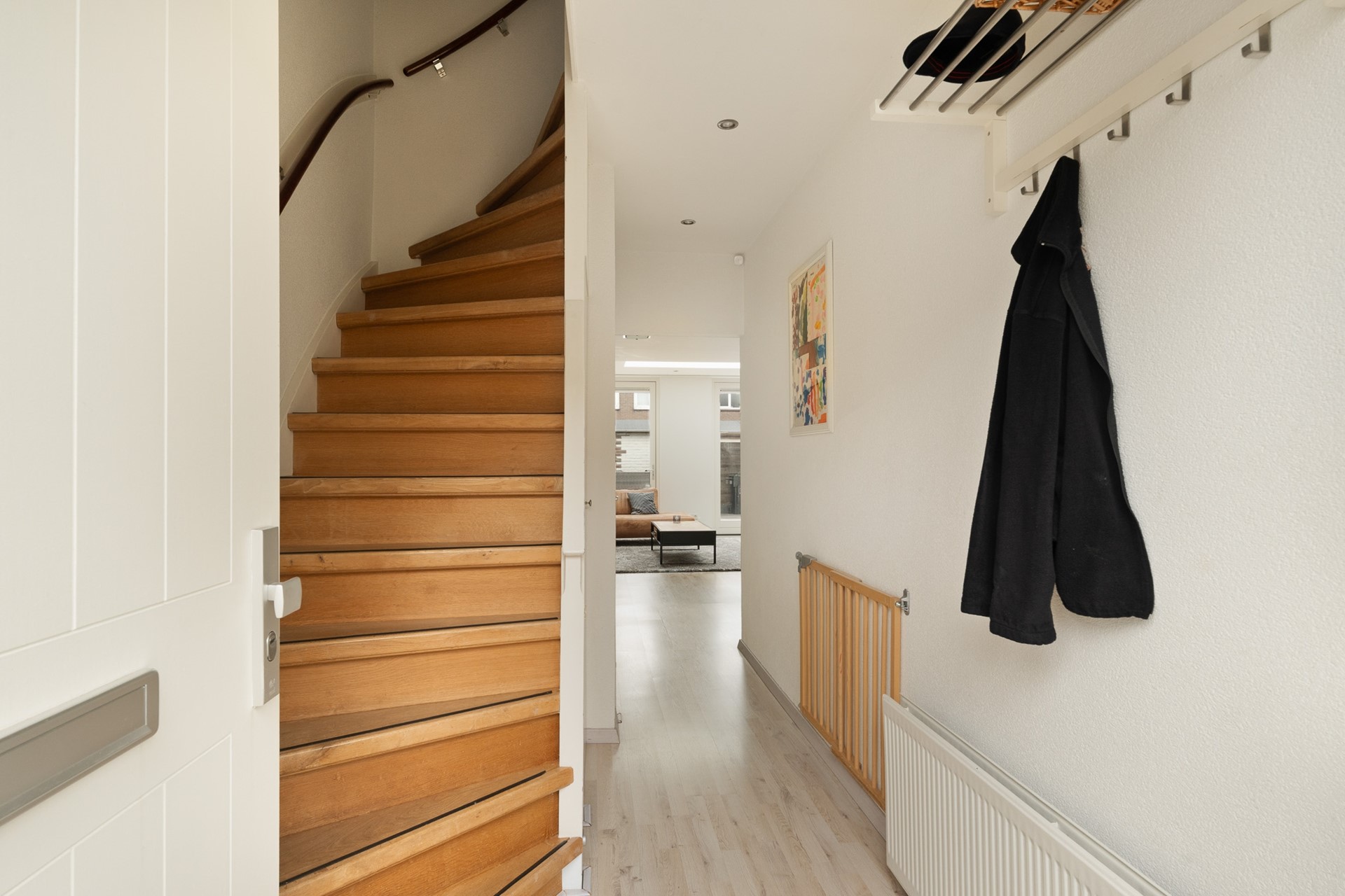 Via de voortuin bereikt u de entree van de woning. In de hal bevinden zich de meterkast, de trapkast, het moderne zwevende toilet en de trap met vernieuwde houten bekleding en een zwarte accentstreep naar de etage.