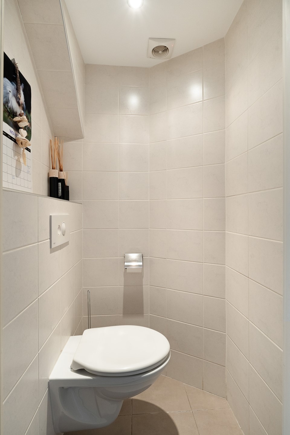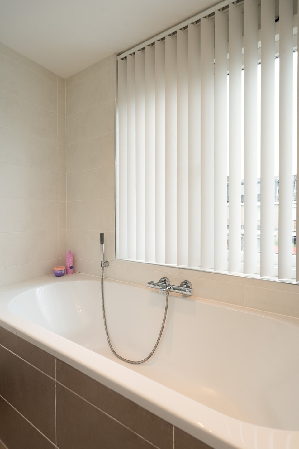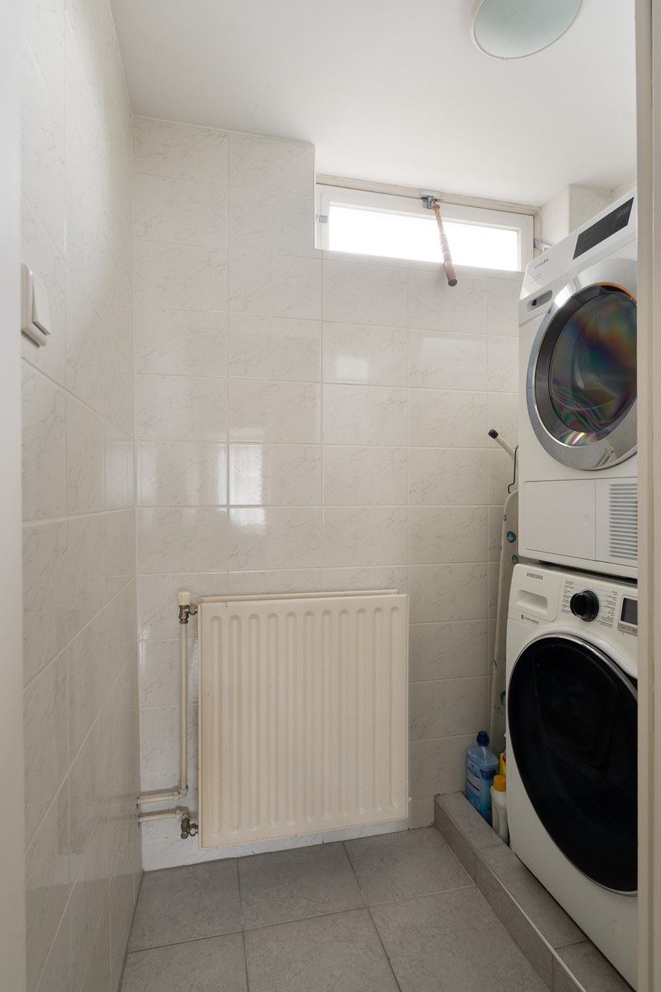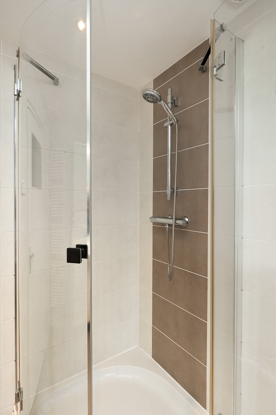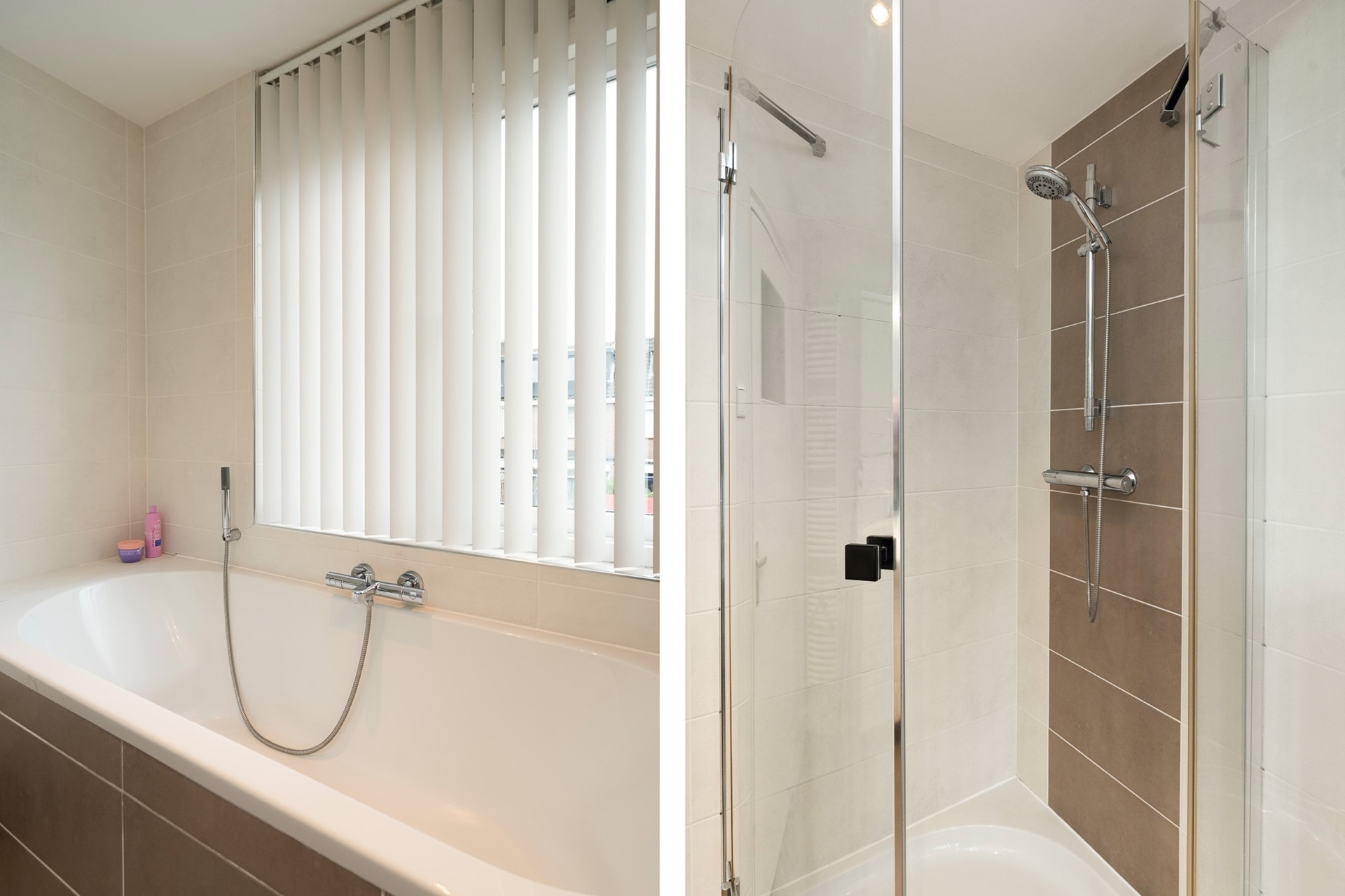 De huidige badkamer is modern uitgevoerd en volledig tot aan het plafond betegeld in een wit-grijze kleurstelling. Deze is uitgerust met een ligbad, een separate douche met thermostaatkranen, een zwevend toilet, een wit wastafelmeubel, een designradiator en mechanische ventilatie. De afwerking is verzorgd en tijdloos.
