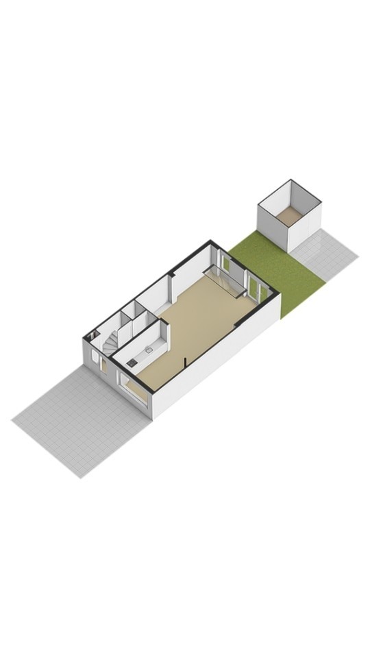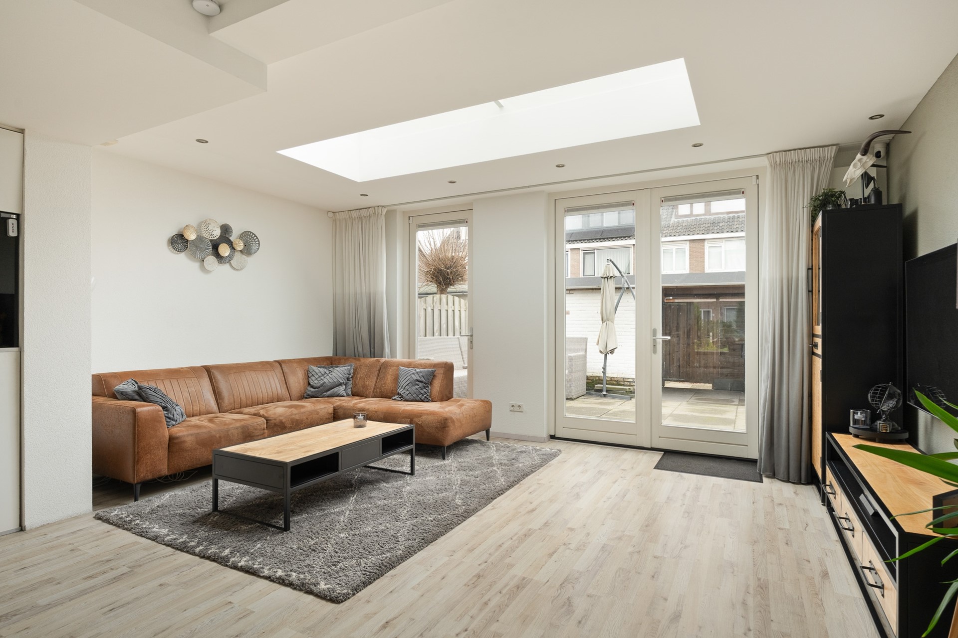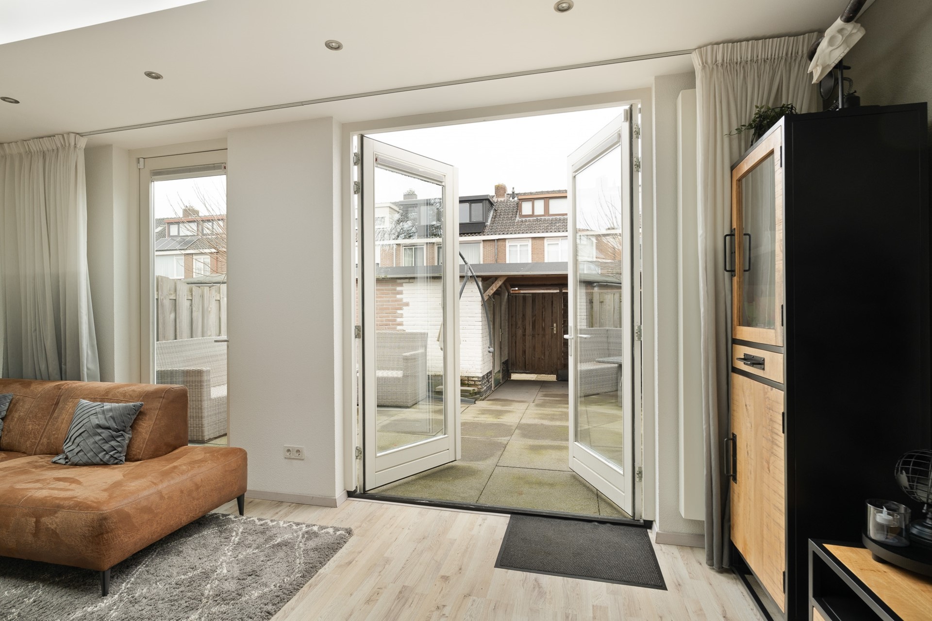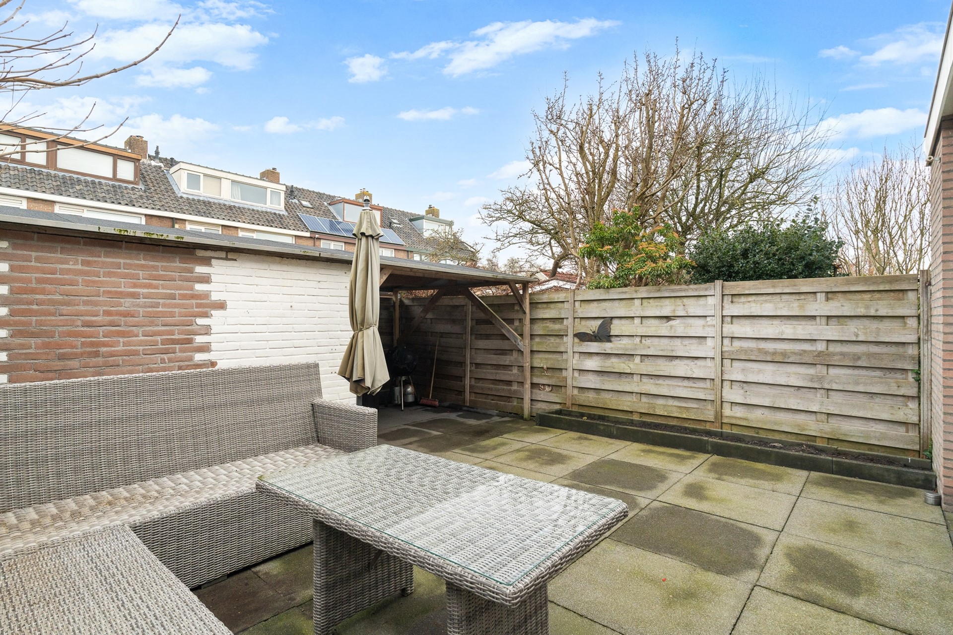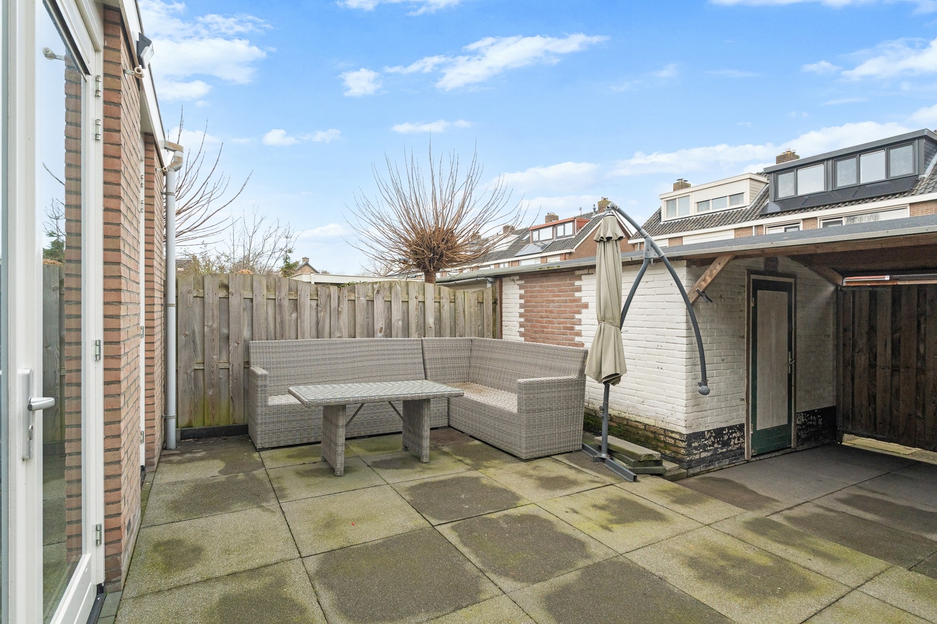 Via openslaande deuren én een separate loopdeur is de achtertuin bereikbaar. Deze tuin is grijs betegeld, onderhoudsvriendelijk en voorzien van een overkapping, waarbij het schuine dak van de aanbouw mooi doorloopt over de berging.