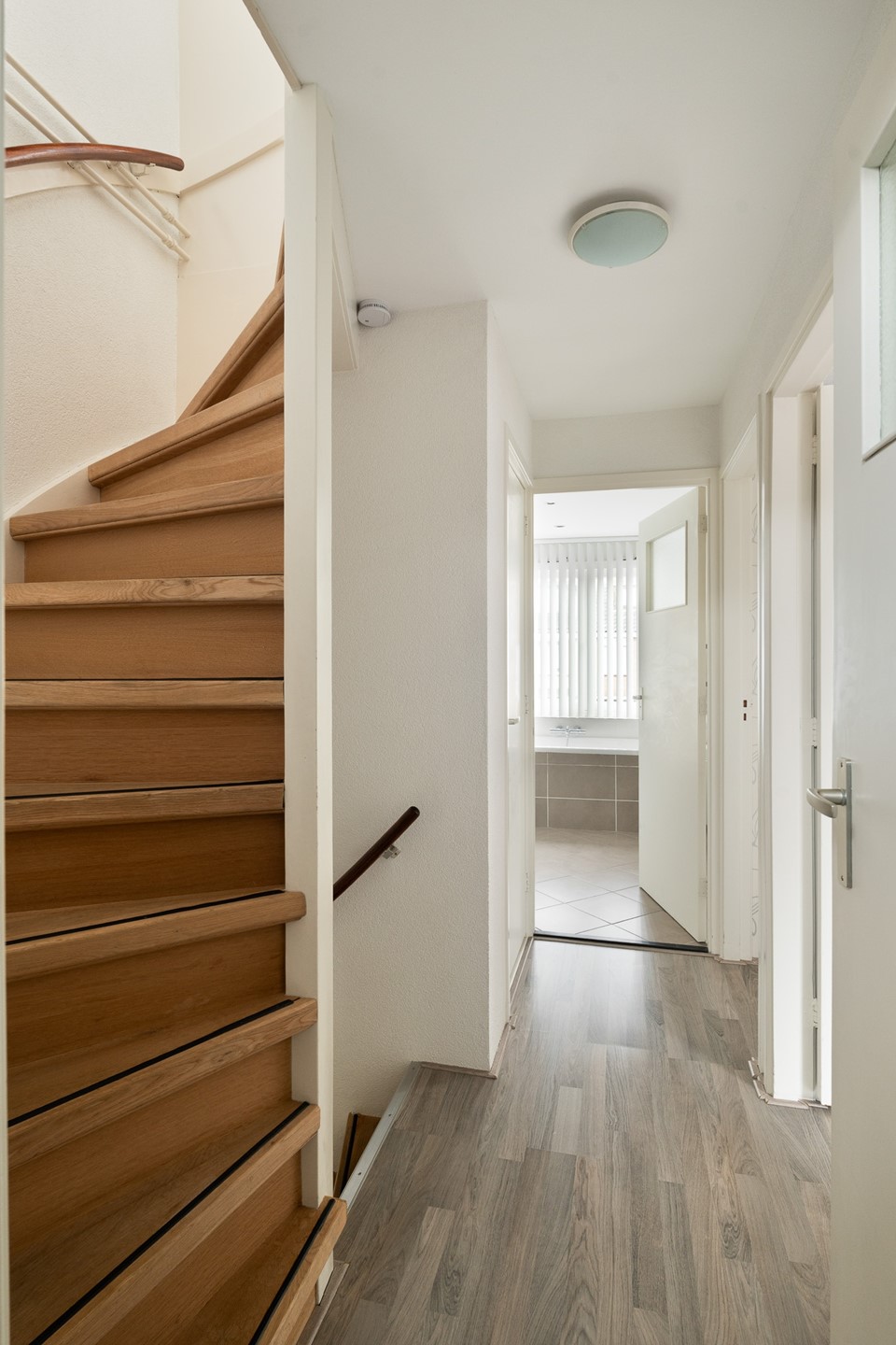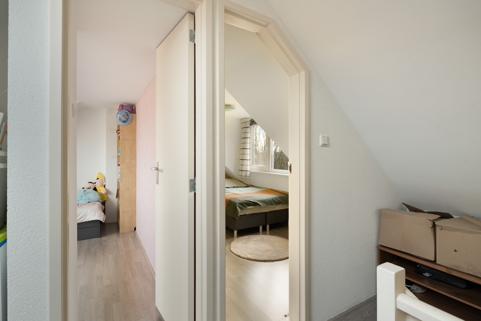 De tweede verdieping is praktisch ingedeeld en verrassend ruim. Op de overloop bevinden zich vaste kasten en de opstelling van de CV-ketel (2011). Ook hier ligt een laminaatvloer die doorloopt over de gehele verdieping.