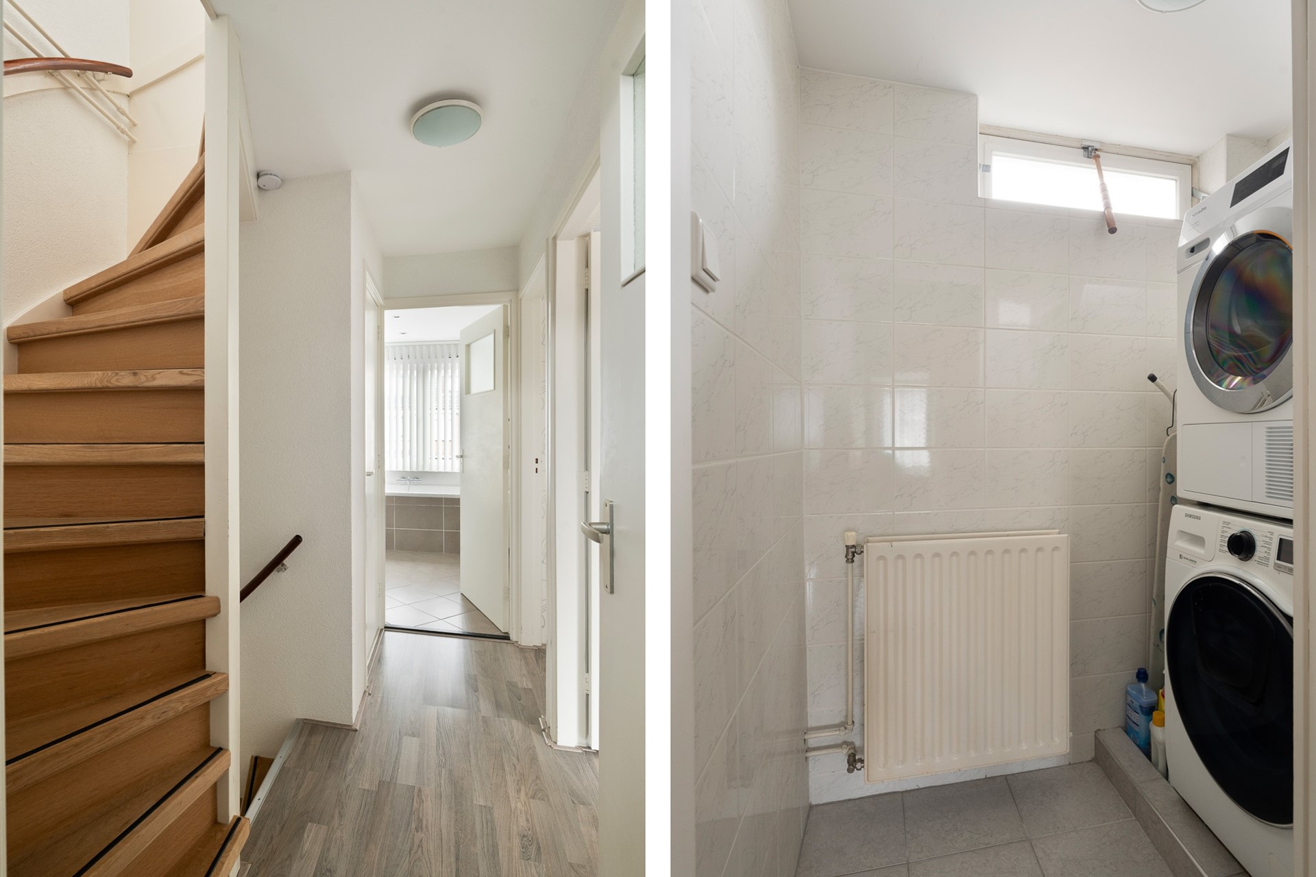 Op de eerste verdieping ligt een laminaatvloer die ook is doorgelegd. Vanaf de overloop zijn twee slaapkamers bereikbaar, evenals een aparte wasruimte, die voorheen als badkamer in gebruik was.