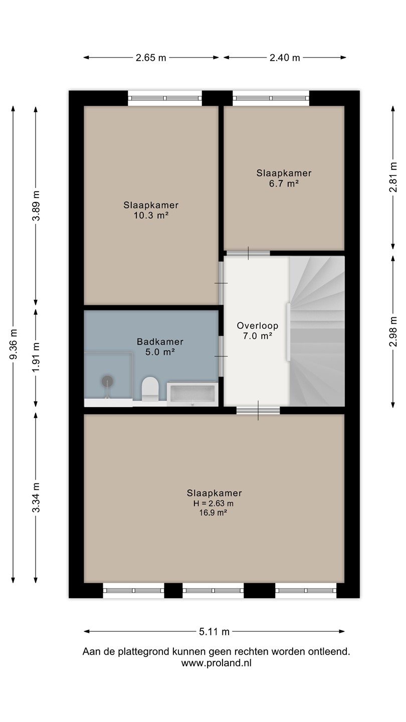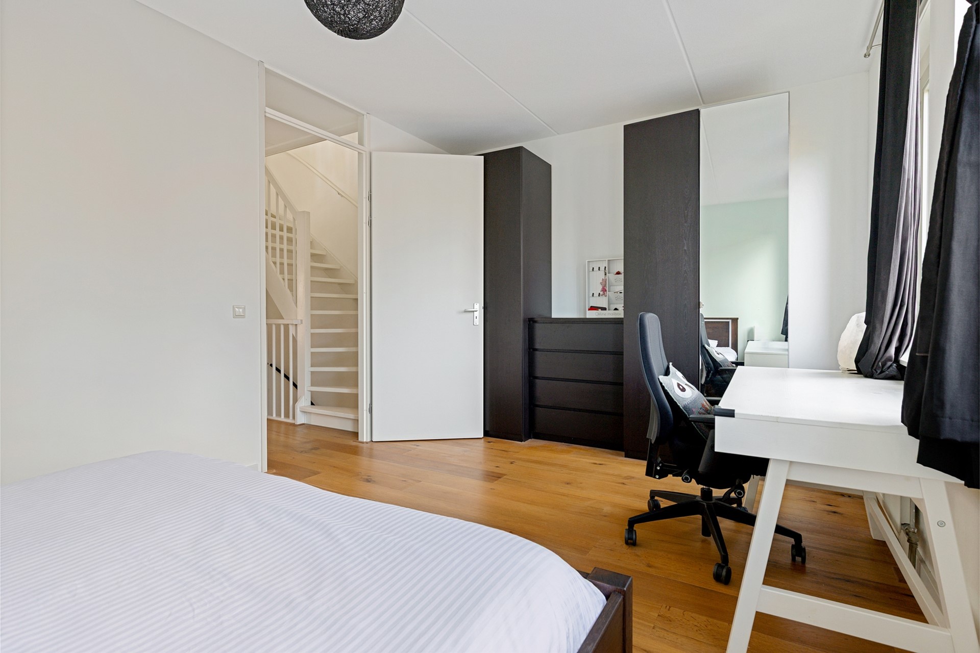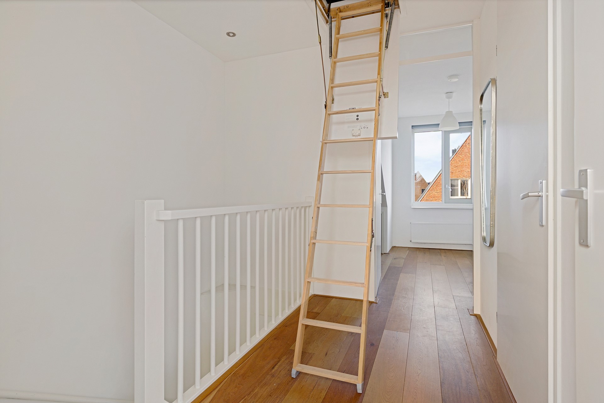 Via de vaste trap bereikt u de ruime overloop van ca. 7 m². Vanaf de overloop is er toegang tot 3 slaapkamers, de badkamer en is er een vaste trap naar de 2e verdieping. Slaapkamer 1 (voorzijde): ca. 17 m² – royale hoofdslaapkamer. Slaapkamer 2 (achterzijde): ruim 10 m². Slaapkamer 3 (achterzijde): ruim 6 m².