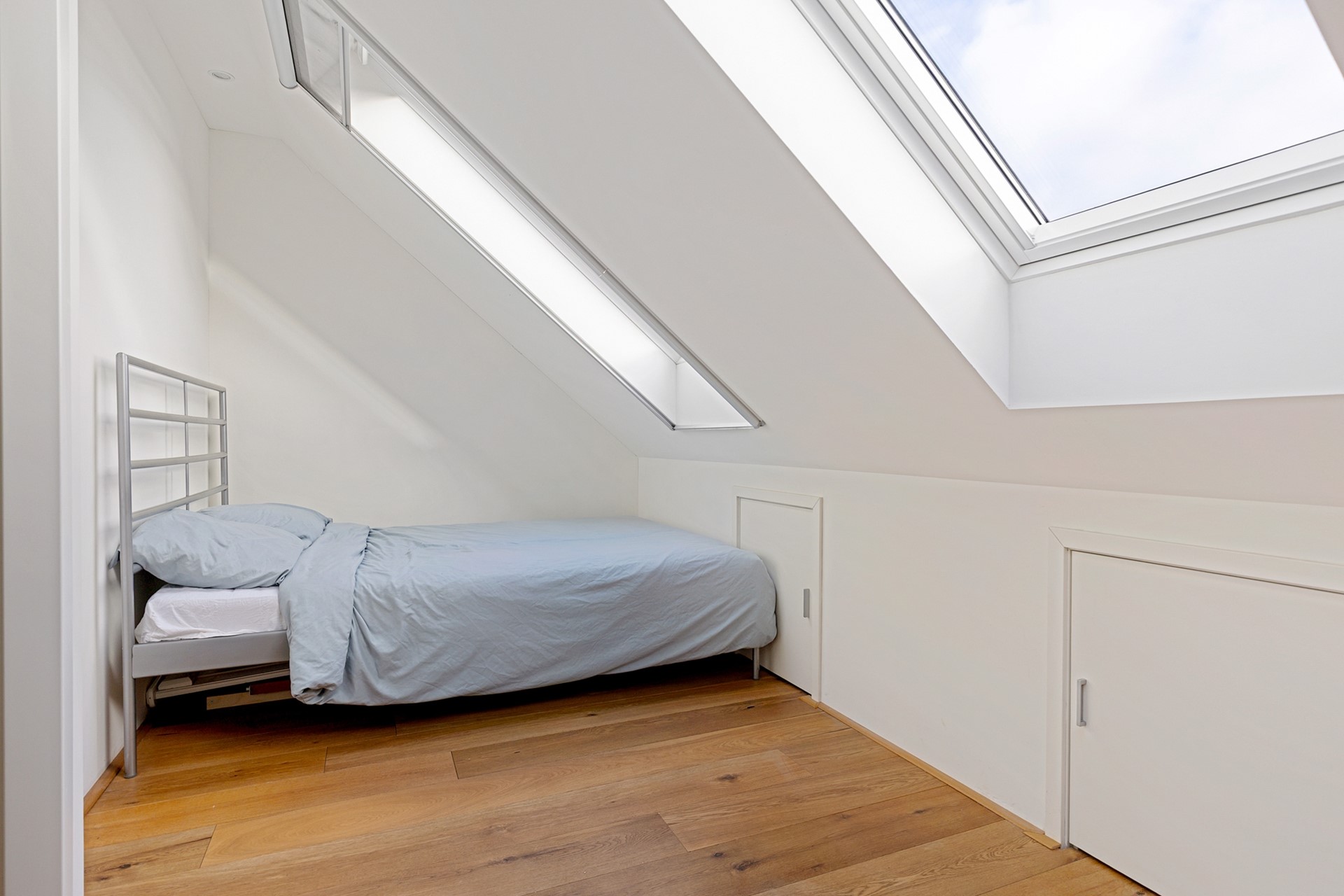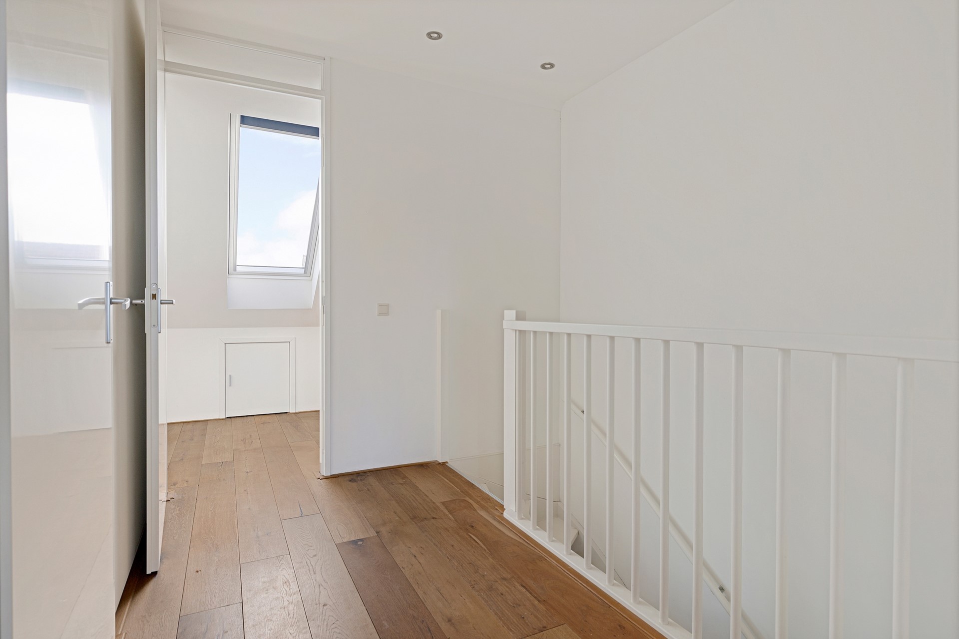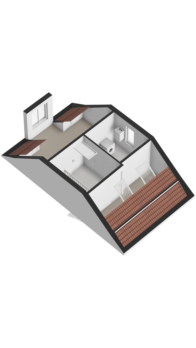 Ook deze verdieping is verrassend ruim. De overloop van ca. 8 m² biedt toegang tot de Inpandige berging / wasruimte / stookruimte – eventueel in te richten als tweede badkamer. Slaapkamer 4 (voorzijde): ca. 14 m², met grote dakkapel en veel licht. Slaapkamer 5 (achterzijde): ca. 10 m², met twee royale 'Velux' kantelramen.