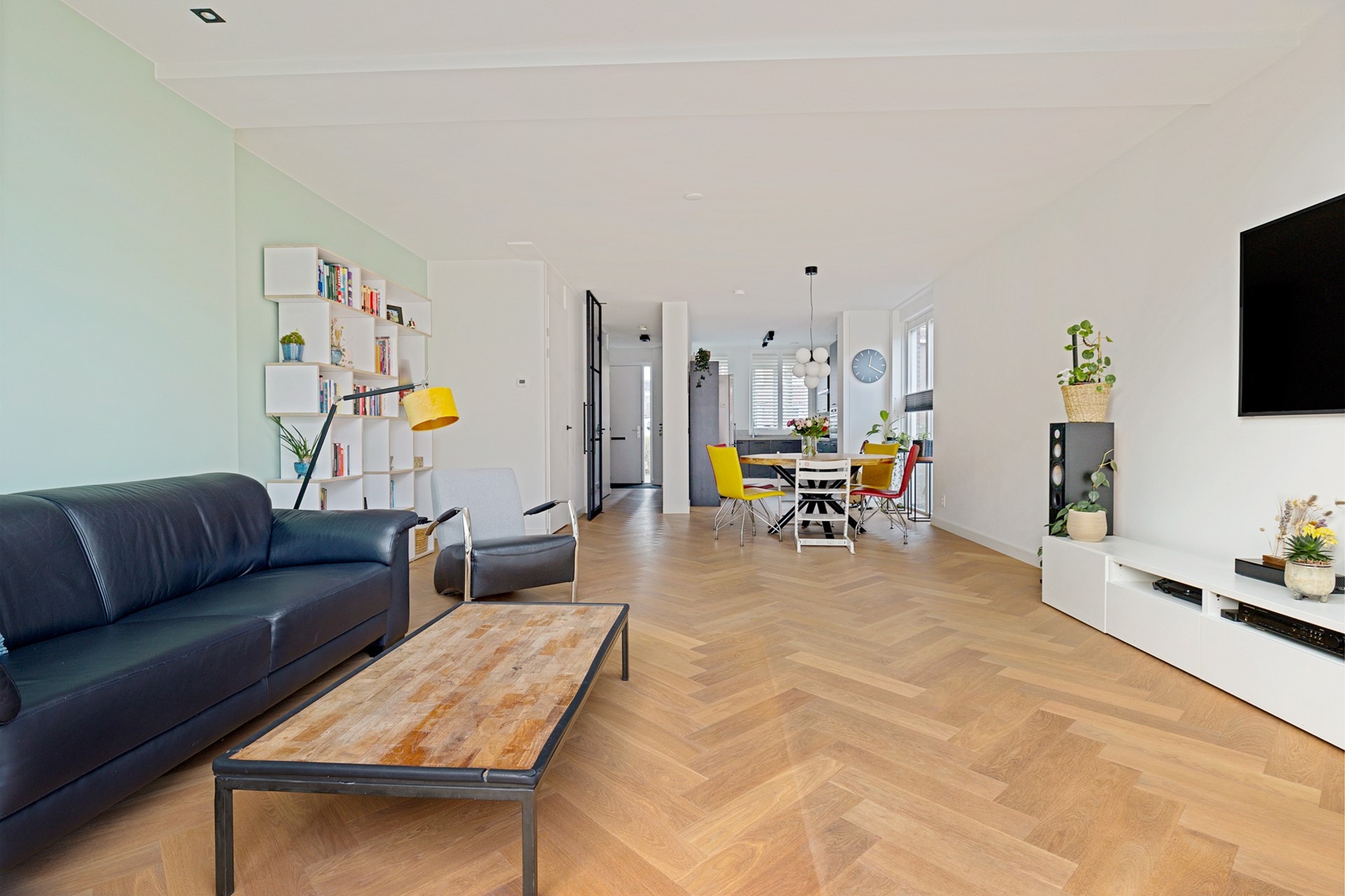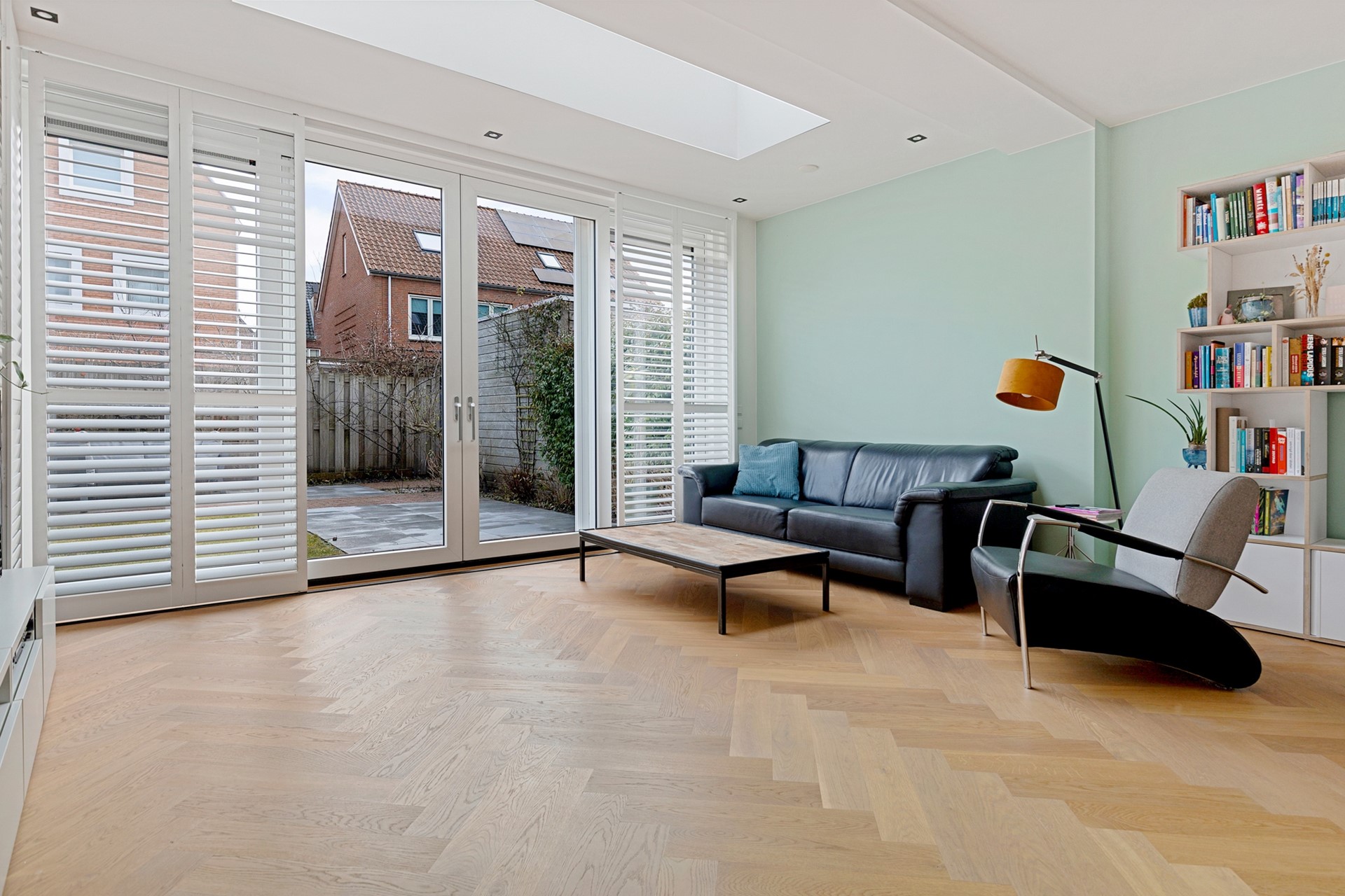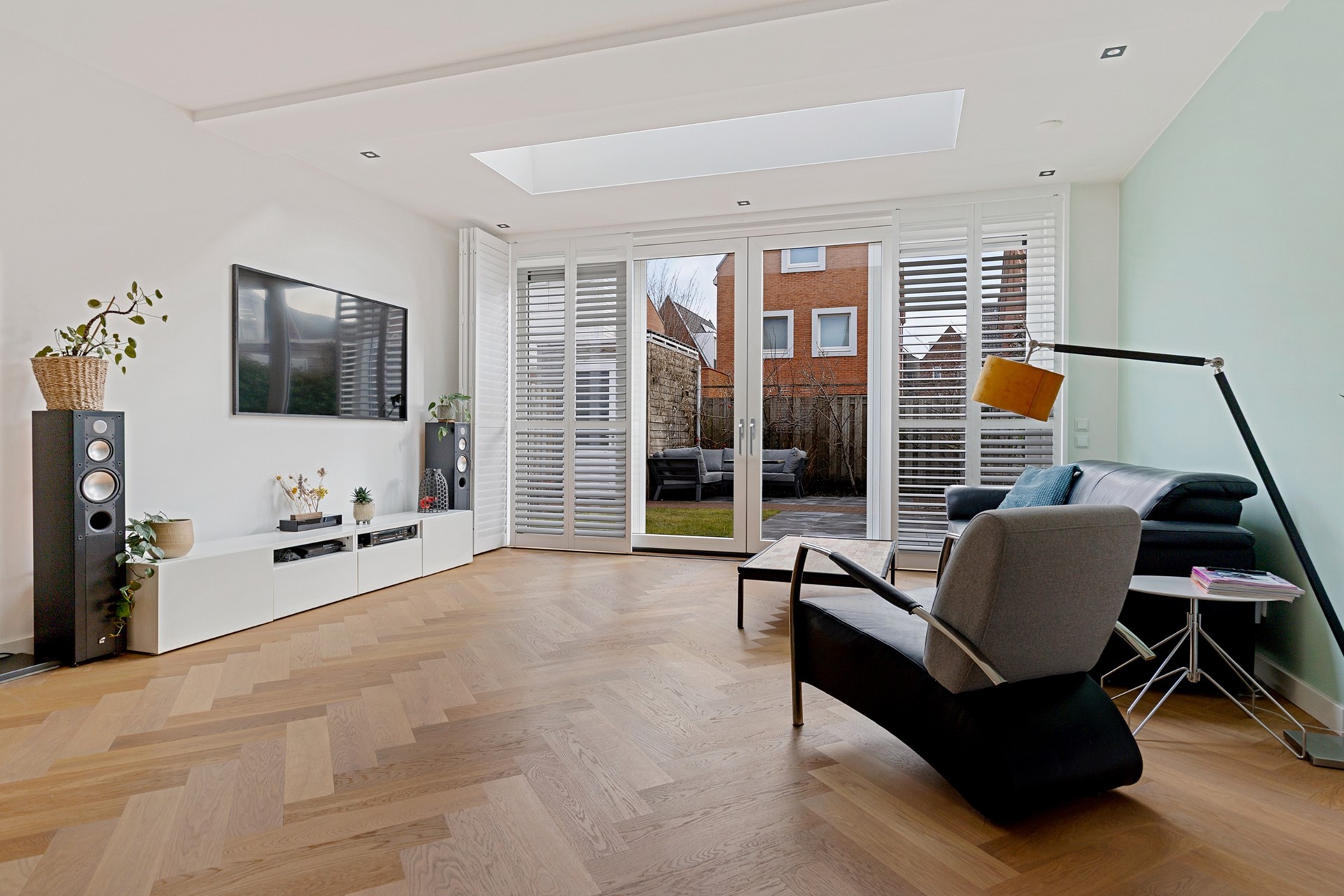 De uitgebouwde woonkamer valt direct op door de aanwezigheid van een design, aluminium taatsdeur, de prachtige, in visgraatmotief gelegde, eiken parketvloer, en de hoeveelheid licht. Dankzij de hoekligging zijn er extra ramen en is er een fijne lichtinval. Aan de achterzijde is er over de hele breedte van de woning uitgebouwd (ca. 12m²), met als eyecatcher een fraai daklicht. De grote schuifpui maakt de toegang naar de achtertuin extra comfortabel. Ook is er een praktische trapkast aanwezig.