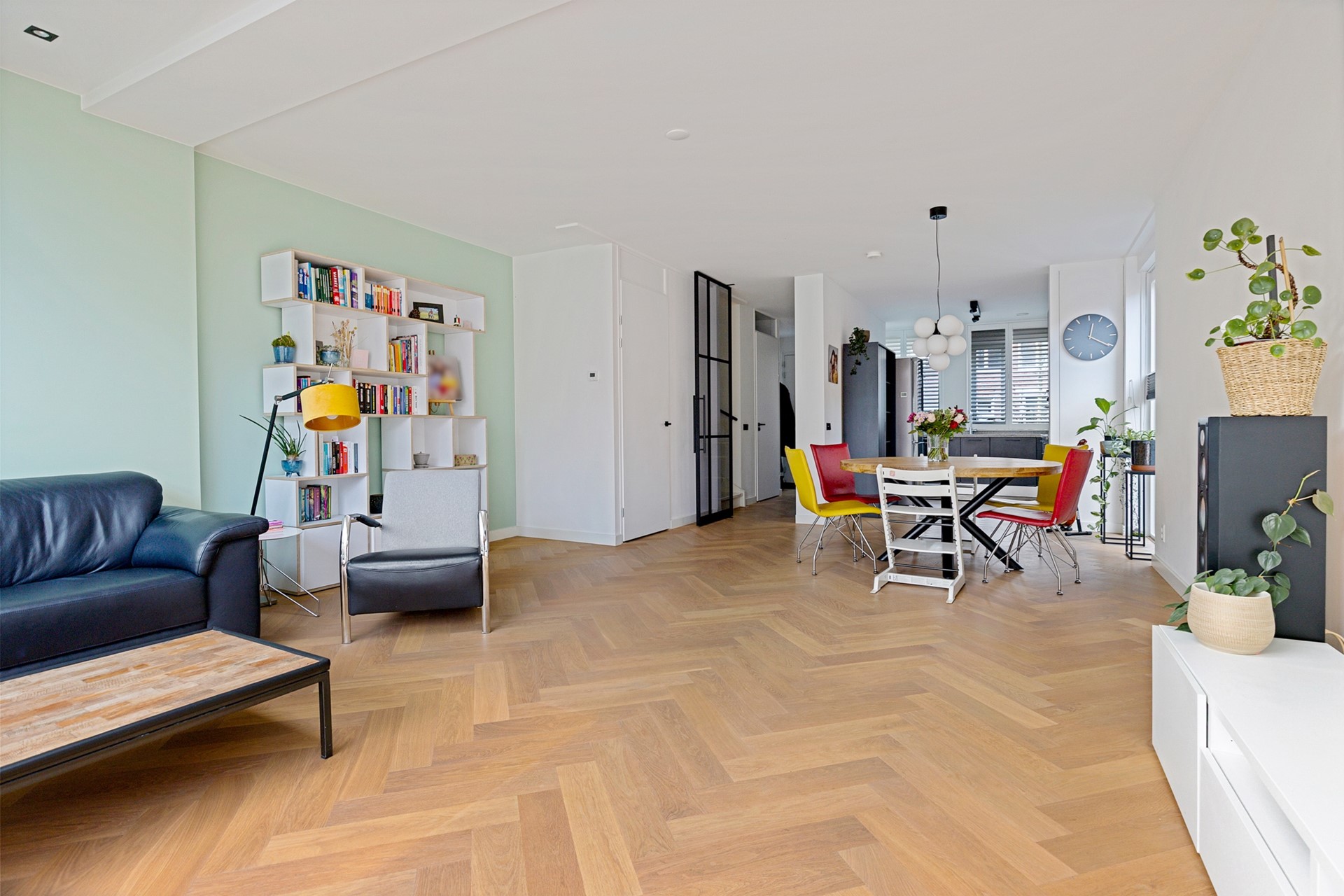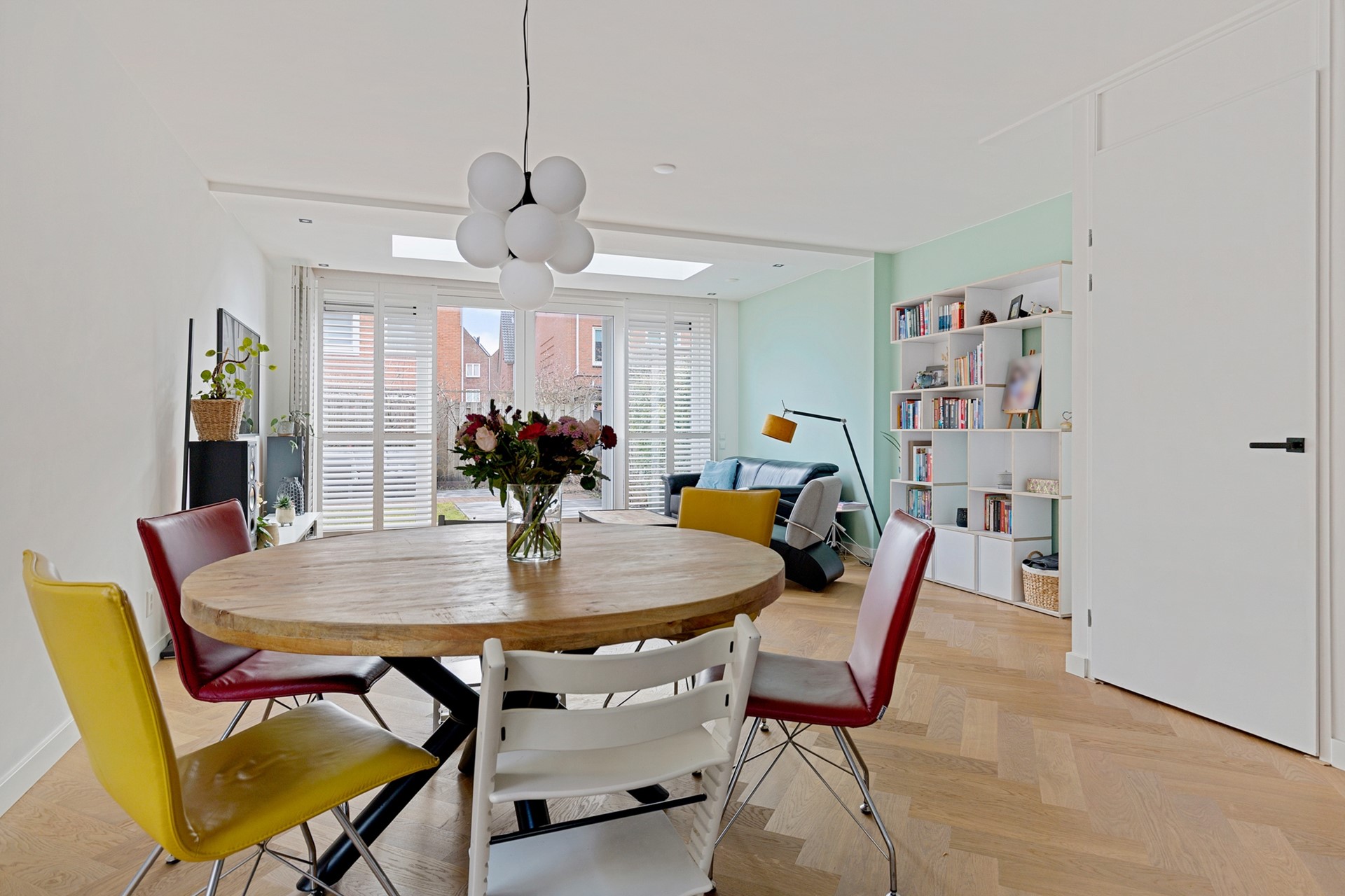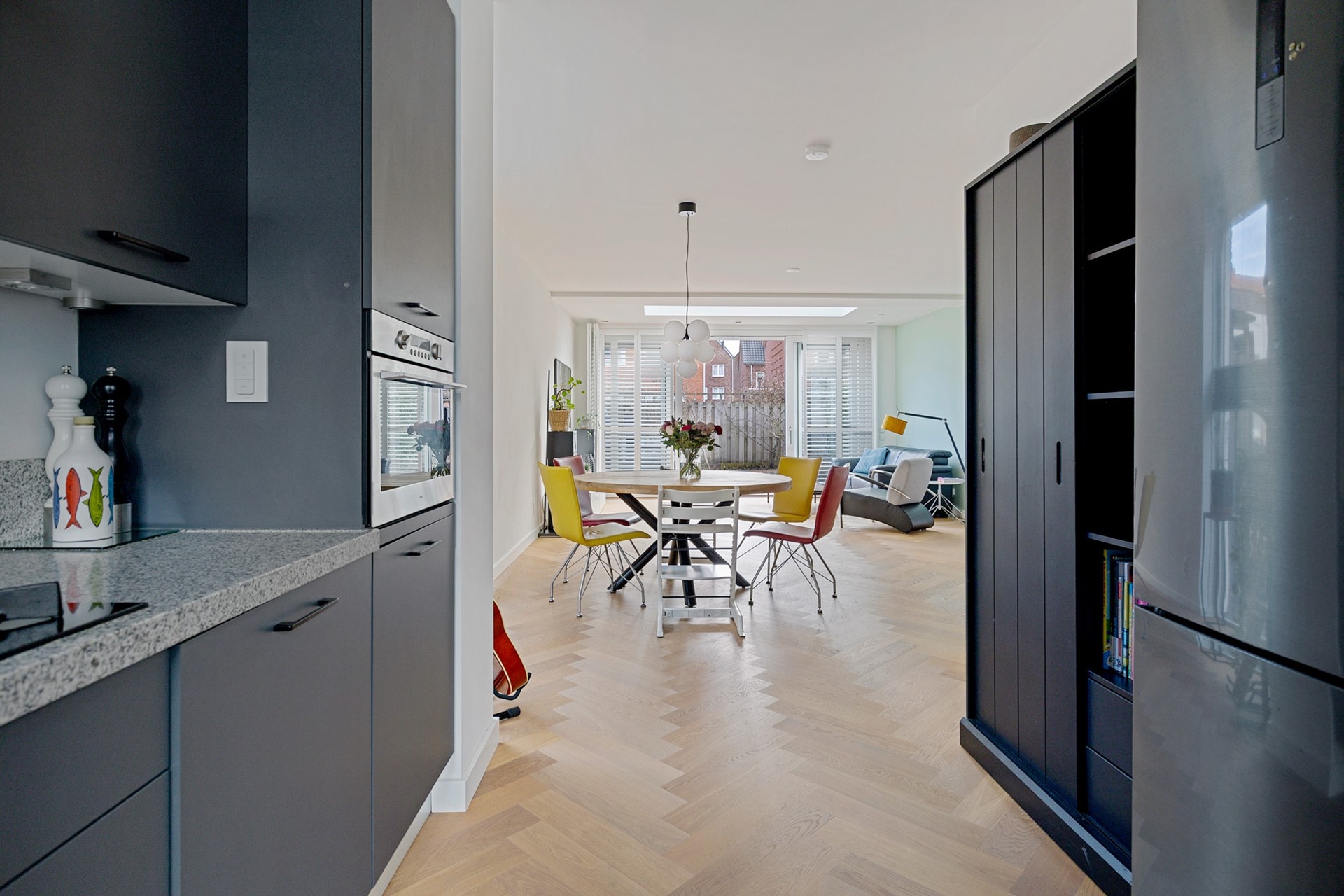 De uitgebouwde woonkamer valt direct op door de aanwezigheid van een design, aluminium taatsdeur, de prachtige, in visgraatmotief gelegde, eiken parketvloer, en de hoeveelheid licht. Dankzij de hoekligging zijn er extra ramen en is er een fijne lichtinval. Aan de achterzijde is er over de hele breedte van de woning uitgebouwd (ca. 12m²), met als eyecatcher een fraai daklicht. De grote schuifpui maakt de toegang naar de achtertuin extra comfortabel. Ook is er een praktische trapkast aanwezig.