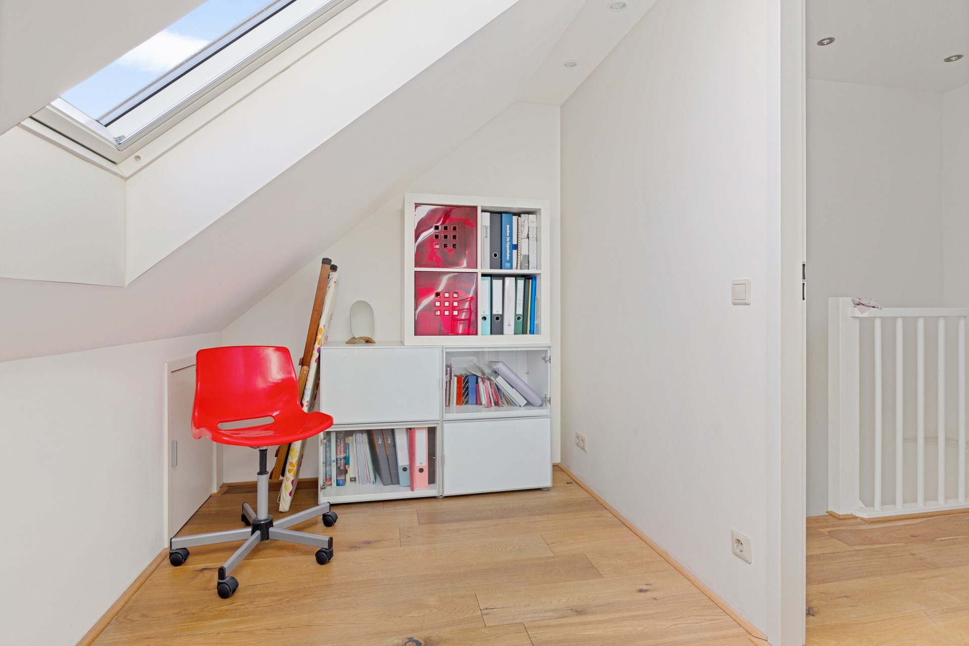 Er is volop slimme, zeer net afgetimmerde bergruimte in de knieschotten aanwezig. Via een vlizotrap is de bovengelegen zolderberging bereikbaar – handig voor vakantiespullen of seizoensopslag.
