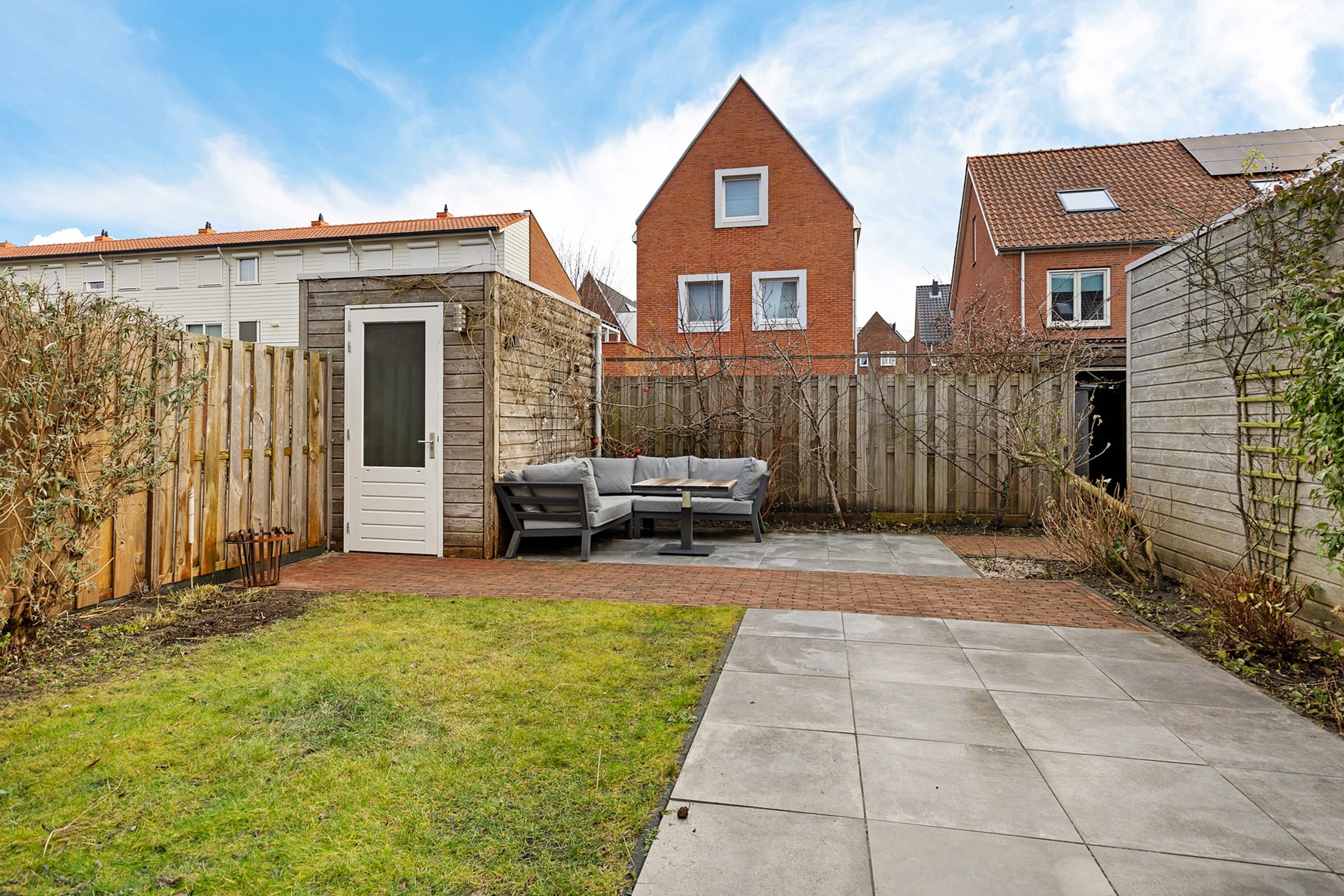 Het perceel is maar liefst 195m² groot en dat merk je in de tuin. De achtertuin is bereikbaar via de voor- en achterzijde, is zeer fraai aangelegd en beschikt over een vrijstaande houten berging van ca. 6 m² en een carport van ca. 14 m². In de carport is plek voor één auto én er is wat extra opslagruimte. Ondanks dat de achtertuin op het oosten is gesitueerd is er altijd een plek in de zon of schaduw te vinden. Via het achterom bereikt u een gemeenschappelijk (mandelig plein) met vrije toegang naar de Langekamp. Ook aan de voorzijde van de woning is de tuin erg netjes en verzorgd aangelegd.